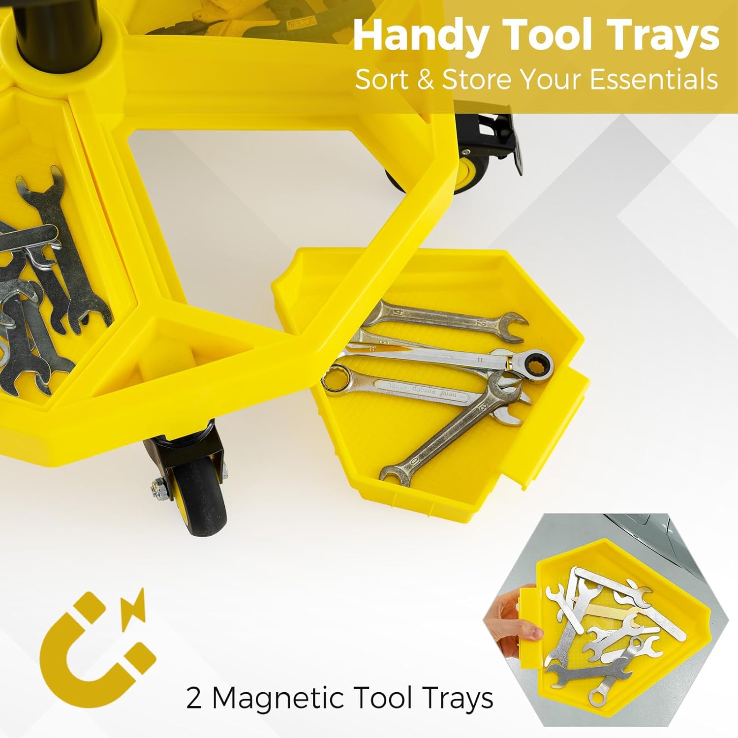 - 【 Handy Tool Trays】 The garage stool features 5 tool trays located at the bottom, including 2 with magnetic surfaces to securely hold metallic parts and tools. The practical design keeps essentials within reach, streamlining your work flow.