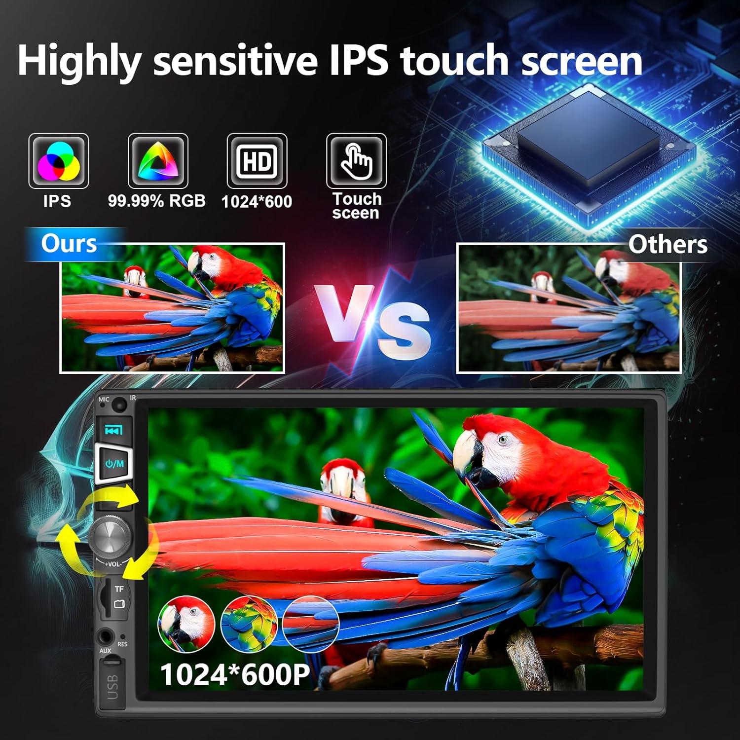- ăBluetooth 5.2 and 1024*600 HD Touch Screenă: When your phone is connected to Bluetooth, you can turn on the hands-free system, free your hands when answering phone calls, and listen to Bluetooth music and more! This unit supports dual control modes of physical buttons, knobs and touch screen, 7-inch 1024*600 HD capacitive touch screen, more sensitive and accurate, while supporting 1080P video playback visual experience!