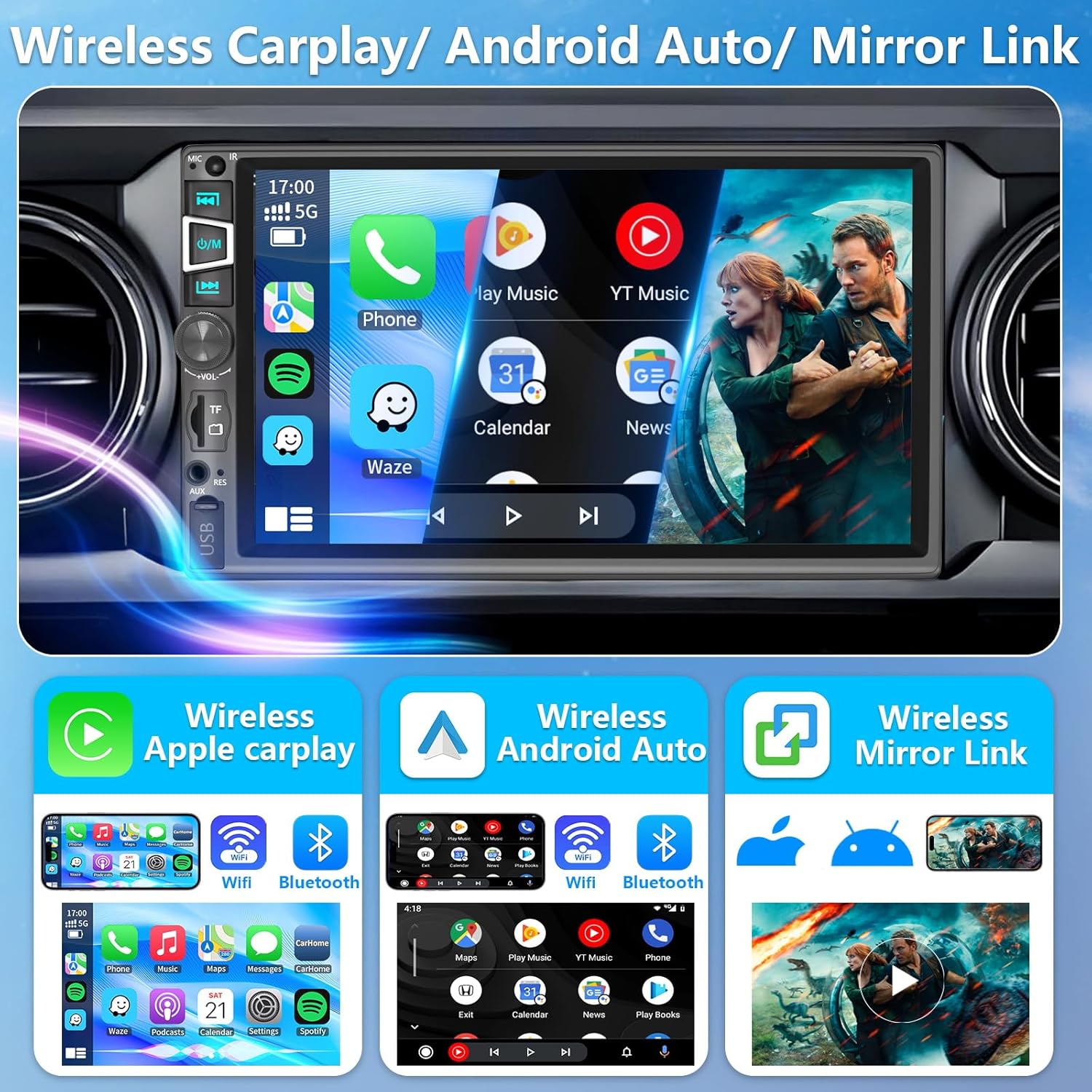 - ăWireless CarPlay & Android Auto&Mirror Linkă: Supporting wireless and USB data transfer, when you enter the car, your phone will effortlessly synchronize with the in-car radio and automatically connect to Carplay/android Auto, while Mirror Link also supports wireless and USB data transfer, seamlessly integrating your smartphone with your car. Mirror Link also supports wireless and USB data transfer, seamlessly integrating your smartphone with your car.