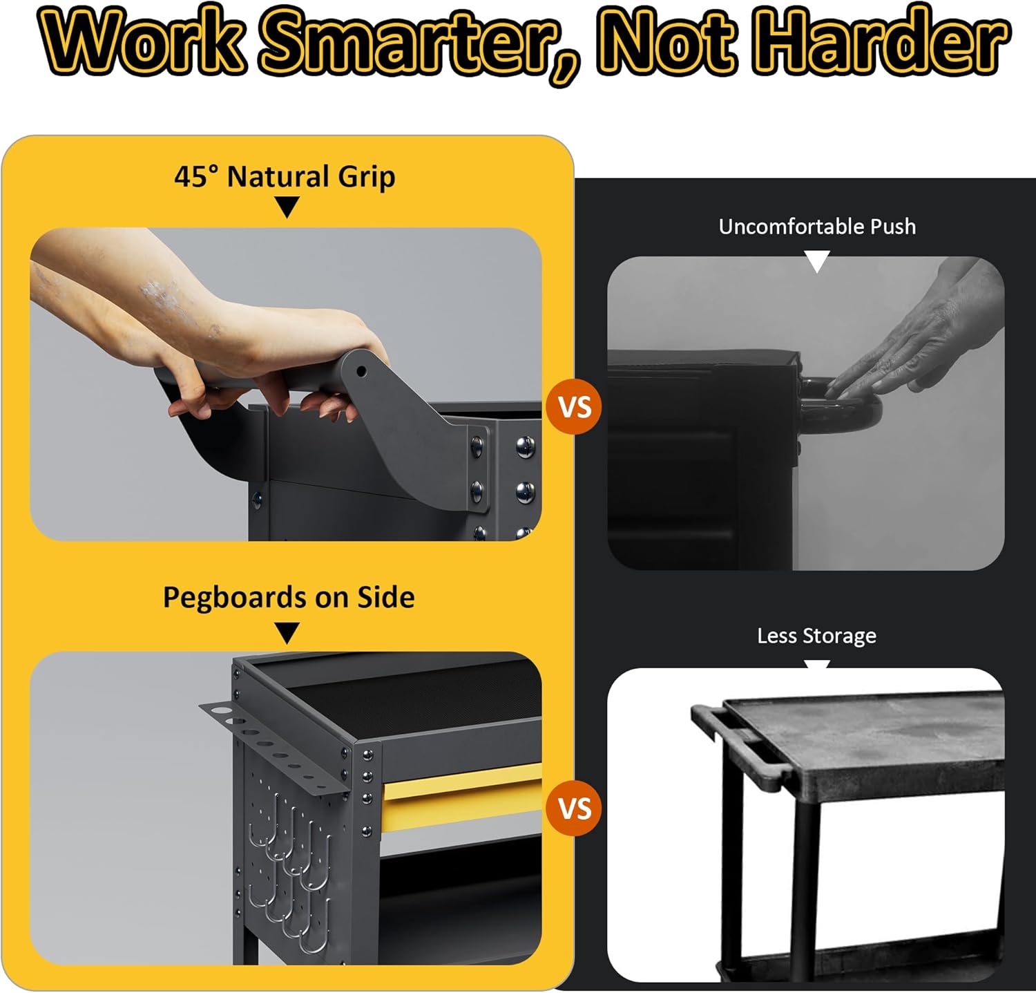 - EFFORTLESS USE: Equipped with two 360° universal casters and two fixed casters, our tool carts glide smoothly, effortlessly transporting heavy objects. The handle features a 45° oblique design, conforming to most people's usage habits and offering maximum comfort. Whether you're moving a power tool organizer cart or other equipment, the operation is a breeze.