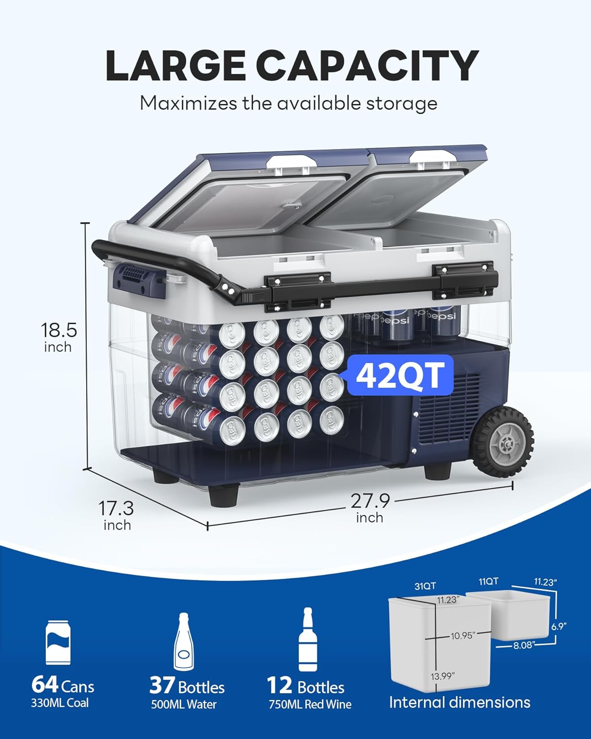 Aeitto 12 Volt Car Refrigerator, 42QT(40L) Dual Zone Portable Car Fridge Freezer -4℉-68℉ Electric Cooler Dual Temp Control Cooling Freezing 12/24V DC & 100-240V AC for Travel, Camping, RV, Road, Home