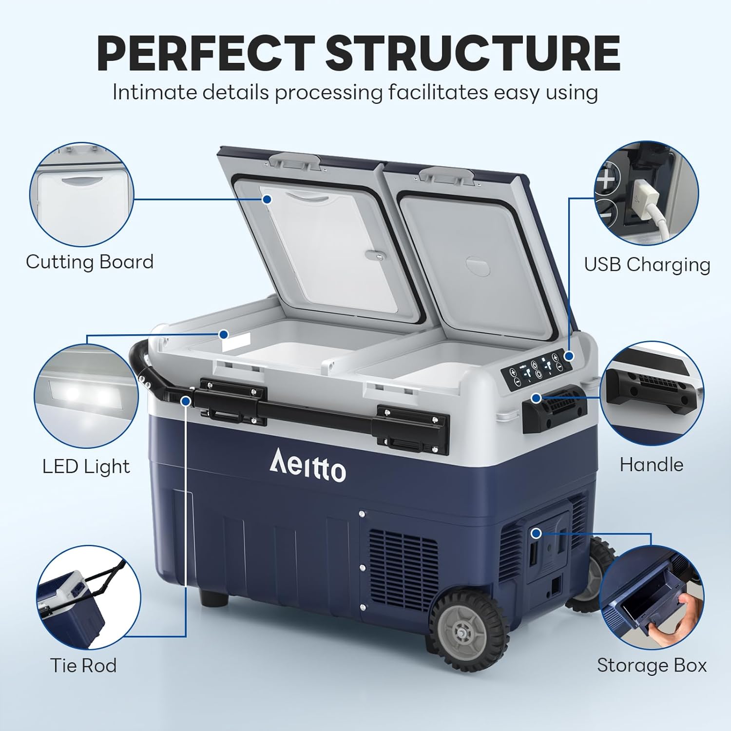 - Dual Zone Temp Control: The Aeitto 12 Volt Car Refrigerator features dual zone independent temperature control, it can be used as both a freezer and a cooler, or one as a freezer and the other as a cooler. With a cooling range of -4 °F to 68 °F (-20 °C to 20 °C), it can fulfill all your freezing and chilling needs. The dual-zone feature provides optimal storage flexibility, ensuring that different types of food, beverages and pharmaceuticals are kept at the ideal temperature