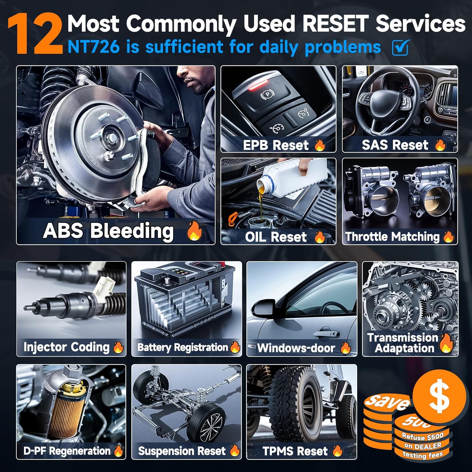 - 【12 Resets | OBD2 Scanners for Mechanics & DIYers】ABS Bleeding, Oil Reset, EPB Reset, SAS Calibration, D-PF Regen, TPMS Reset, Injector Coding, Throttle Matching, Window/Door Control, Transmission Adaptation, Suspension Reset, and Battery Registration. Save $500+/year by clearing fault codes, resetting maintenance lights, and diagnosing ABS/SRS issues. Works with 1996+ OBD2/EOBD/JOBD vehicles globally. Lifetime free updates ensure compatibility. Ideal for mechanics, DIYers, and car owners.