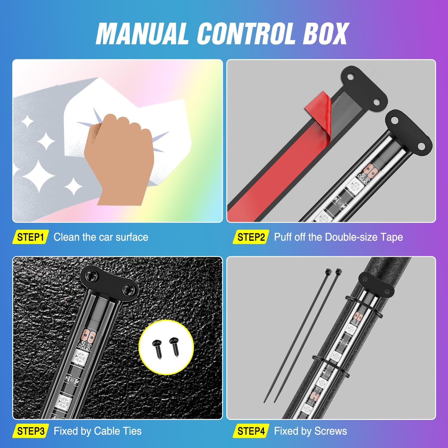 - EASY TO INSTALL:There are three installation methods including double-sided tape fixing, cable tie fixing, and screw fixing, which can make the car light bar more firm and stable and not easy to fall. The 2-wire design can be easily hidden and installed in the gap, almost invisible.