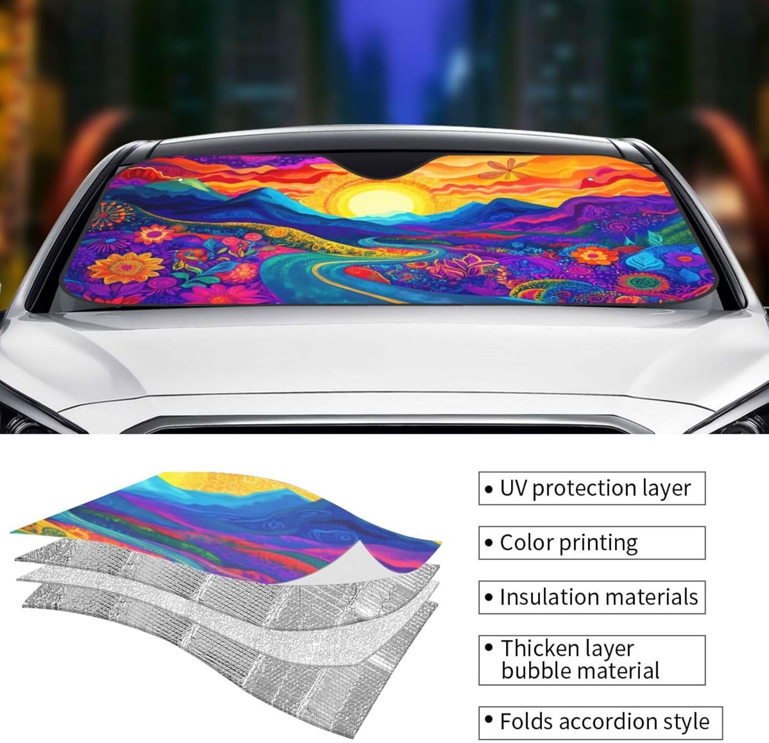 - Stylish Design:This Shade Covers Every Bit Of The Windshield, Fun And Eye-Catching Pattern Can Quickly Spot Your Car And Inject Some Personality Into Your Ride. Fade Free Design Draw Others Attention And Fully Show Your Personal Taste.