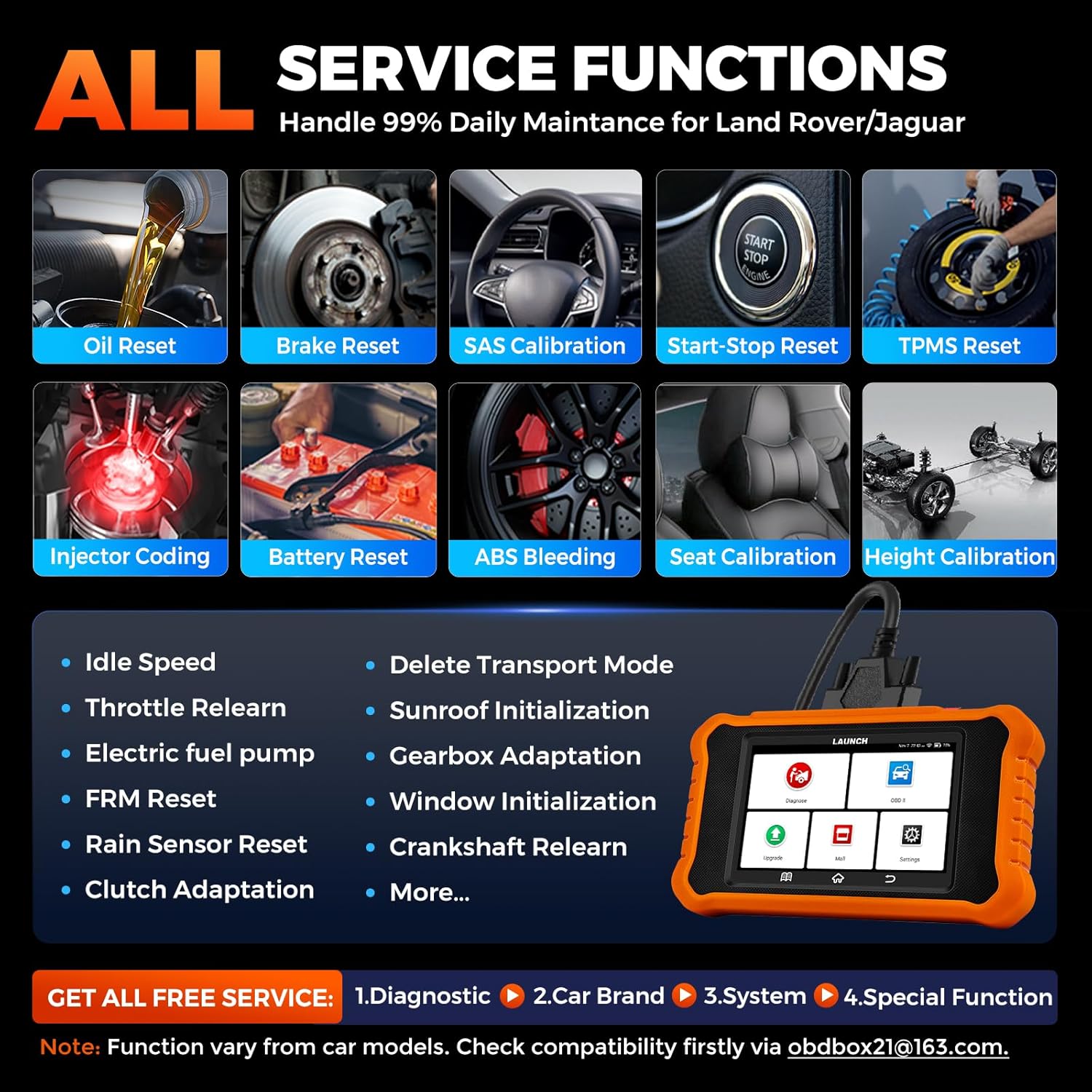 - ăALL FREE MAINTENANCE SERVICEă LAUNCH Creader Elite V2.0 diagnostic scan tool offers ALL FREE Services for Land Rover Jaguar, make daily repair a breeze, such as Oil, EPB, Battery, SAS, Injector Coding, Throttle Relearn, Height Calibration, Transmission Adaption, Crankshaft/Camshaft Relearn, Sunroof Calibration, etc. Save your ton of repairing buck from dealership. đ©Get All services from "Diagnose>Brand>System Selection>Special Function". Check compatibility via đ© obdbox21 @ 163 . com firstly.