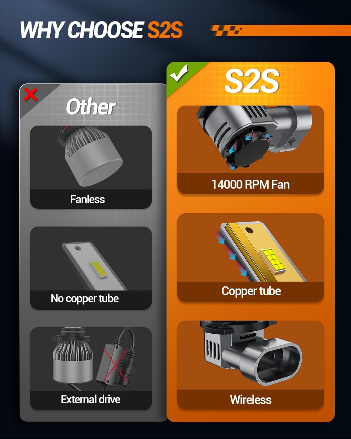 - Wide View And Safer: The S2S 9012 fog bulb is equipped with advanced smart IC drives with radiating distances of 1600F, 40000 lumens and 6500K cool white, ensuring a clearly visible driving experience at night. Made of high - speed cooling fans and single copper tubes, our bulbs keep low operating temperatures and provide reliable performance at night for longer life of over 60,000 hours.