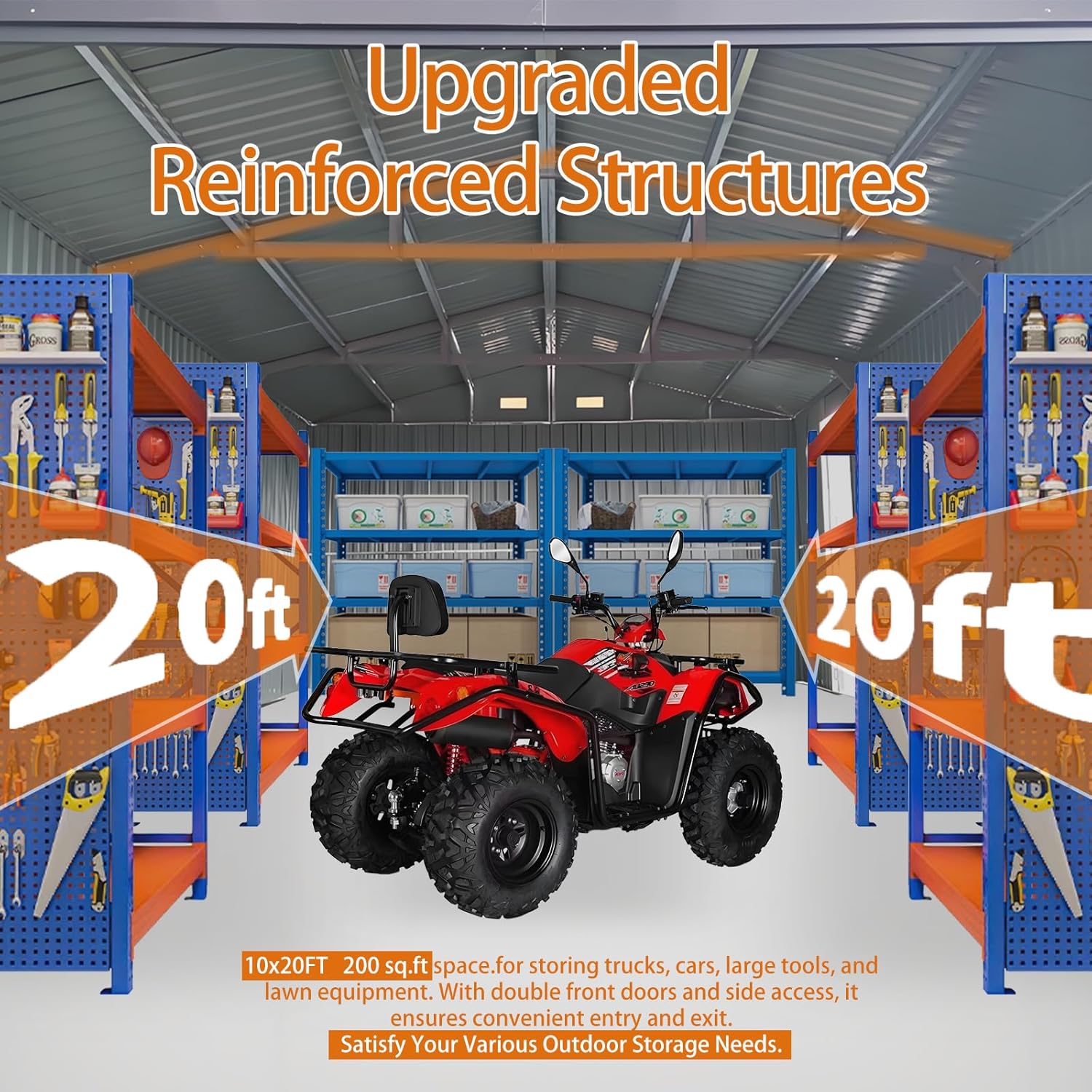 - Spacious 10x20FT Metal Shed for All Your Storage Needs: This Car Sheds Outdoor Garage provides an impressive 185 sq. ft of walk-in storage space, perfect for cars, trucks, bikes, and large equipment. The metal shed features durable galvanized steel construction with a powder-coated frame, offering superior protection against weather and rust. With double hinged doors and lockable security, this storage shed large keeps your belongings safe and organized.