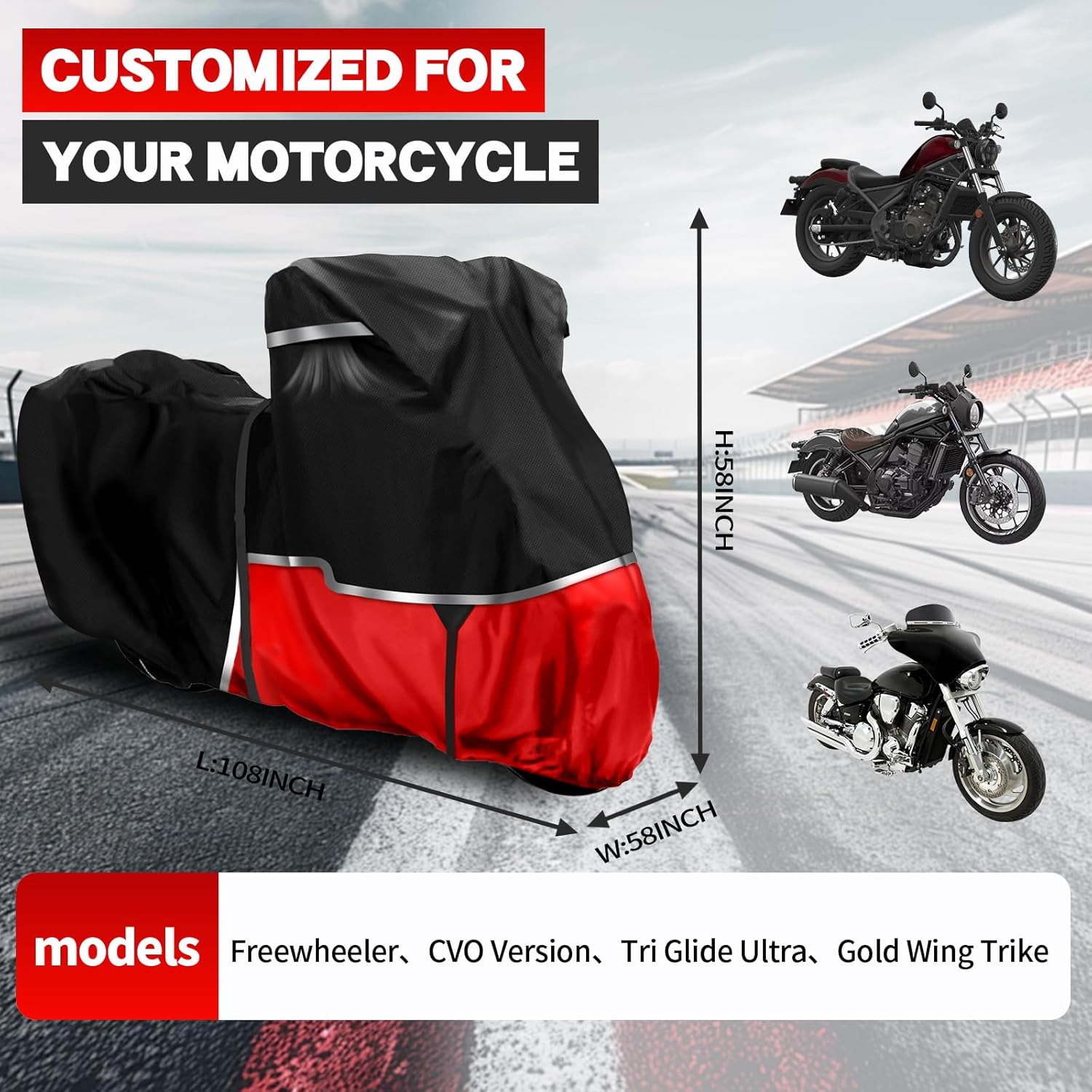 - Package Contents and Usage Tips: This set includes a heavy-duty motorcycle cover with adjustable buckles, reflective strips, ventilation holes, and a keyhole. For best results, allow the engine to cool before using the cover to prevent heat damage. Designed for all-weather protection against rain, wind, UV rays, and dust