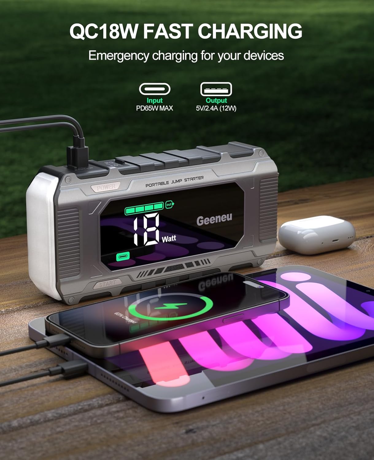 - AS A BACKUP POWER BANK: The jump pack equipped with dual output ports (USB + Type C) which support 18W fast charging to supply power for your mobiles, earphones, and other electronic devices to ensure they stay online and solve your urgent low-battery needs during your outdoors