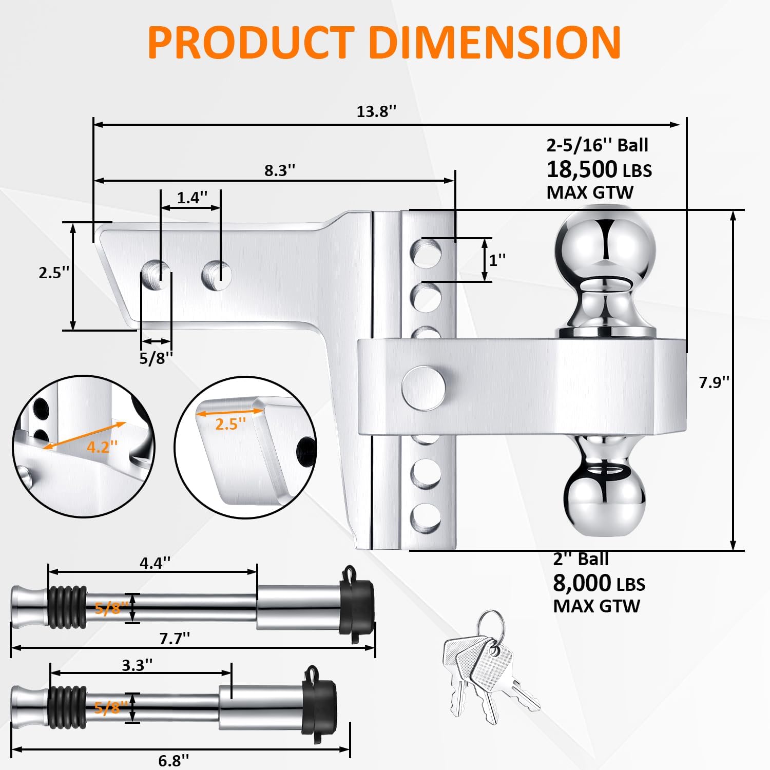- 【DUAL BALLS, QUICK CHANGE OUT, STRONG PULLIONG FORCE】: Really convenient truck hitch with integrated balls. The 2”hitch ball is with towing capacity of 8000lbs and the 2-5/16” hitch ball are with 18500lbs towing capacity which allows for 6”drop down depth and 6”rise height so the hitch can be easily adjustable for optimal towing. With trailer hitch, you can turn the hitch over without having to change the the balls all the time.No worry about choosing a wrong drop any more.