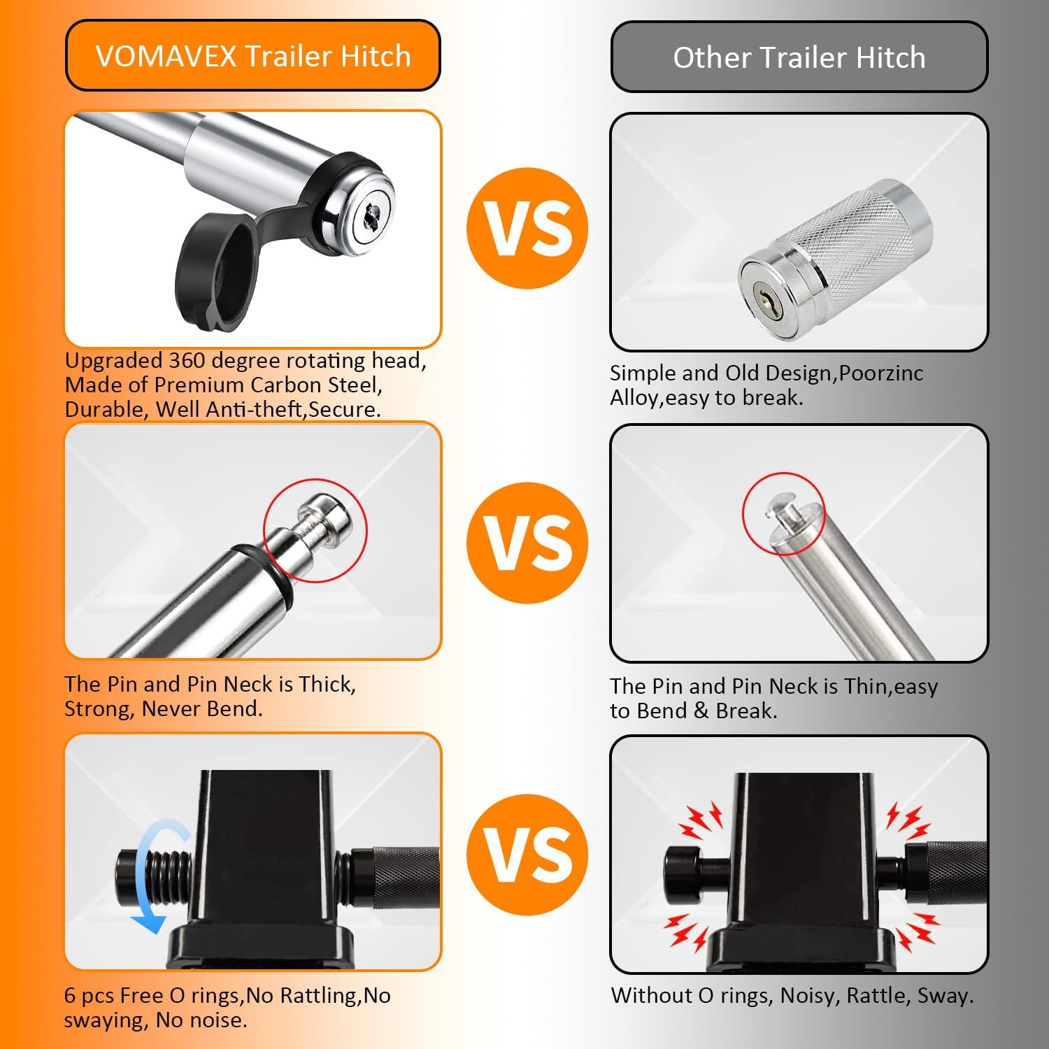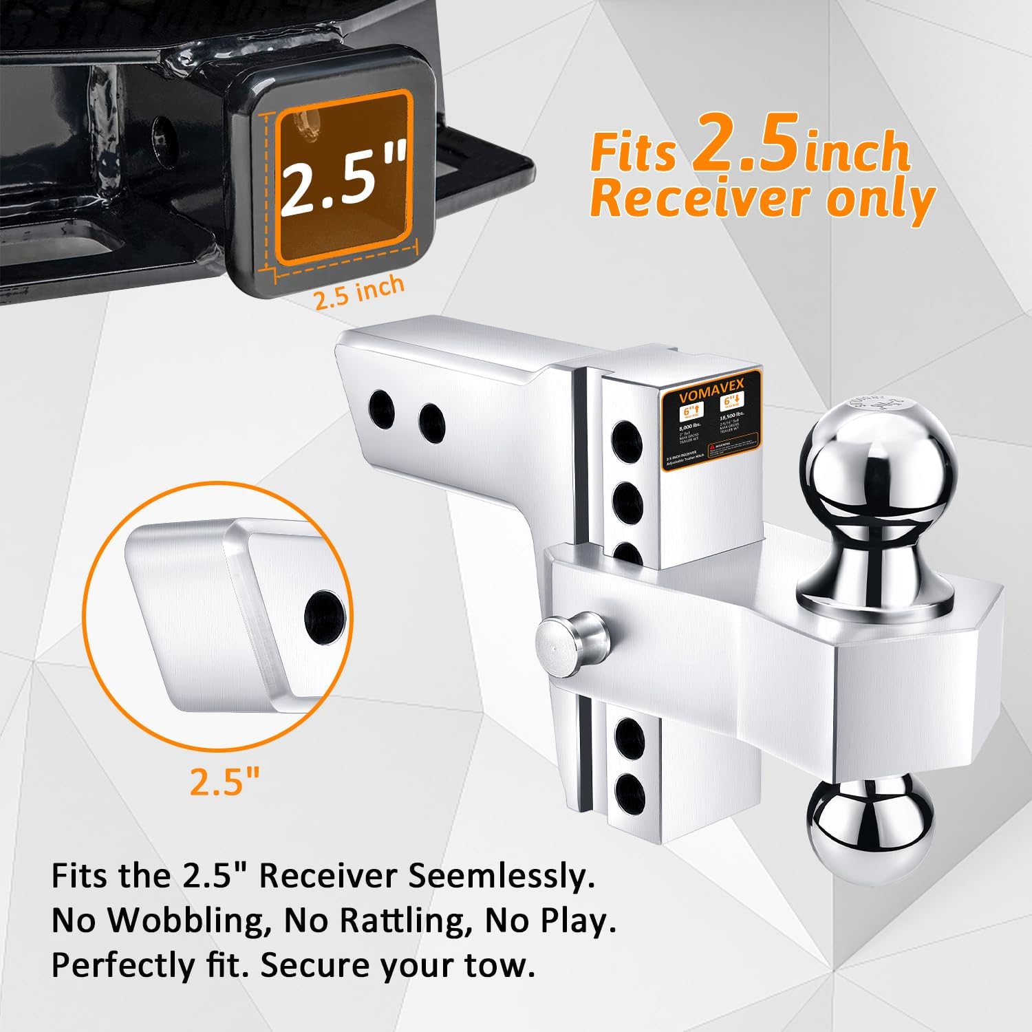 - 【FITS 2.5” RECEIVER ONLY, VERSATIBLE COMPATIBILITY】: Vomavex Adjustable Trailer Fitch Fits 2.5-Inch Receiver Effortlessly Fits a wide arrange of connectors including Trucks, RVS, Farm Trailers, Cargo Trailer, Live stock trailer, Campers and even off-road vehicles like ATVS and Motorcycles. So whether you are towing a small utility trailer or a heavy duty camper, this hitch will never let you down.