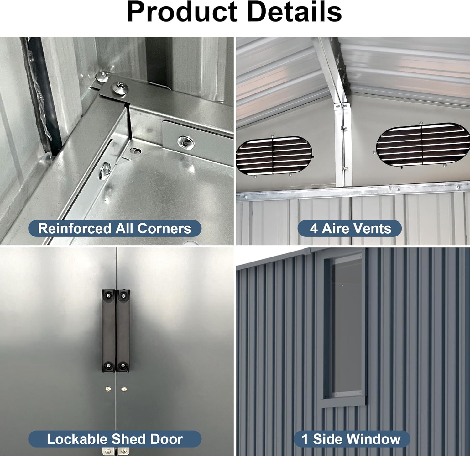 - Metal Storage Shed Waterproof and Complementary Design: Roof has double side slope grooves, allowing rainwater to flow off quickly and protecting your stored items. It includes a window, 4 built-in vents, and lockable doors for better air circulation and comfort during hot summers. Whether modern or traditional, our shed will complement your garden perfectly.