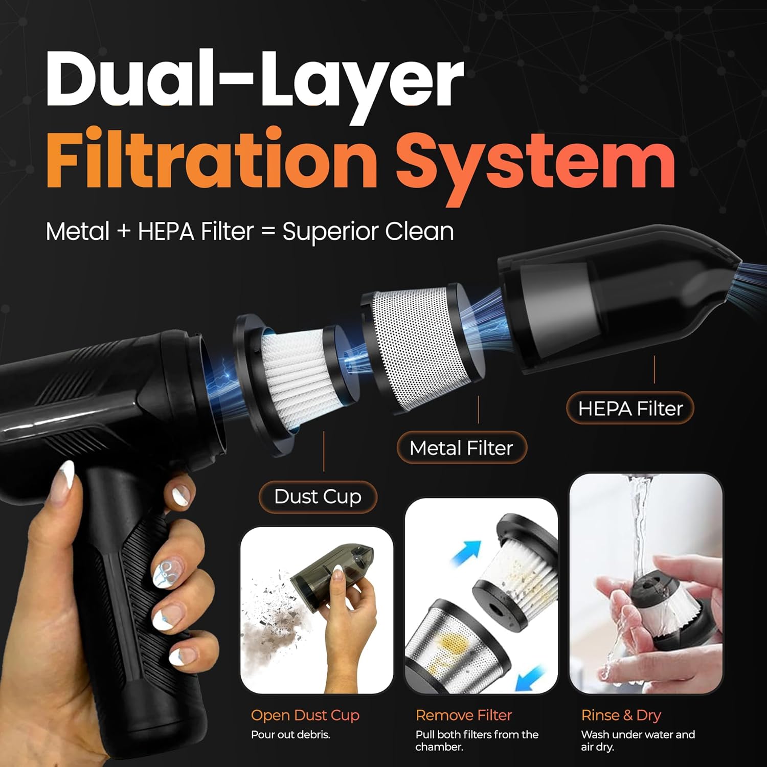 - High-Power Suction & Blower – Features a 65,000 RPM brushless motor with 14,000PA suction and 80MPH airflow. This cordless car vacuum cleaner is perfect for deep cleaning of homes, and outdoor gear