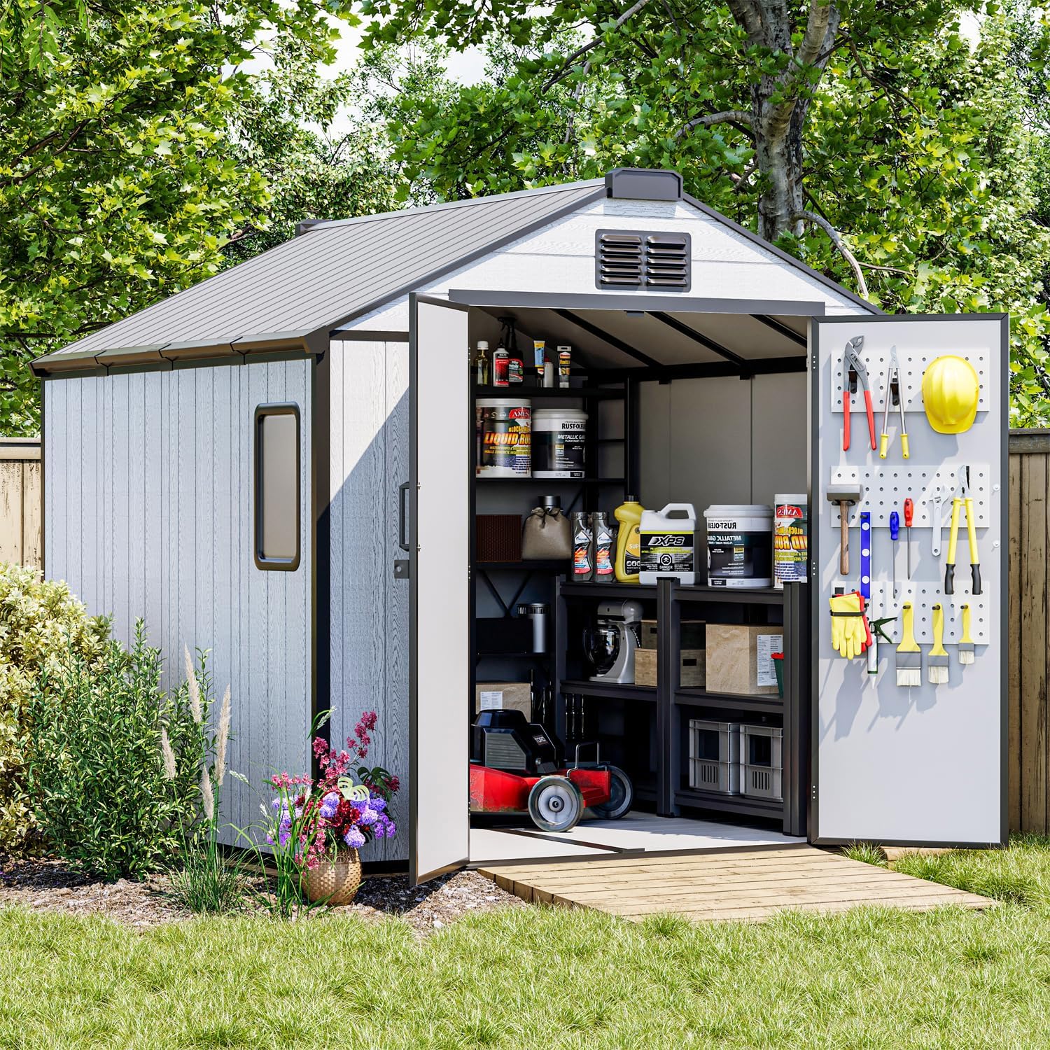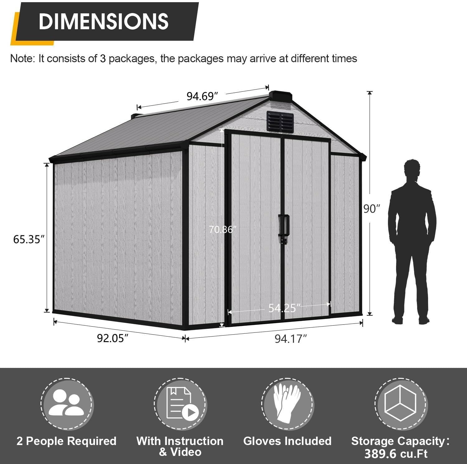 8 x 8 FT Resin Tool Shed, All-Weather Outdoor Storage Shed with Floor, Lockable Doors & Windows, Plastic Garden Shed for Poolside, Backyard, Patio