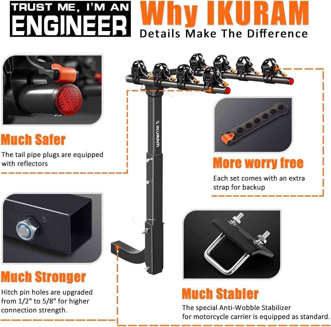 - More Accessories: This bike hitch rack comes with strap, hitch tightener and hitch locking pin.