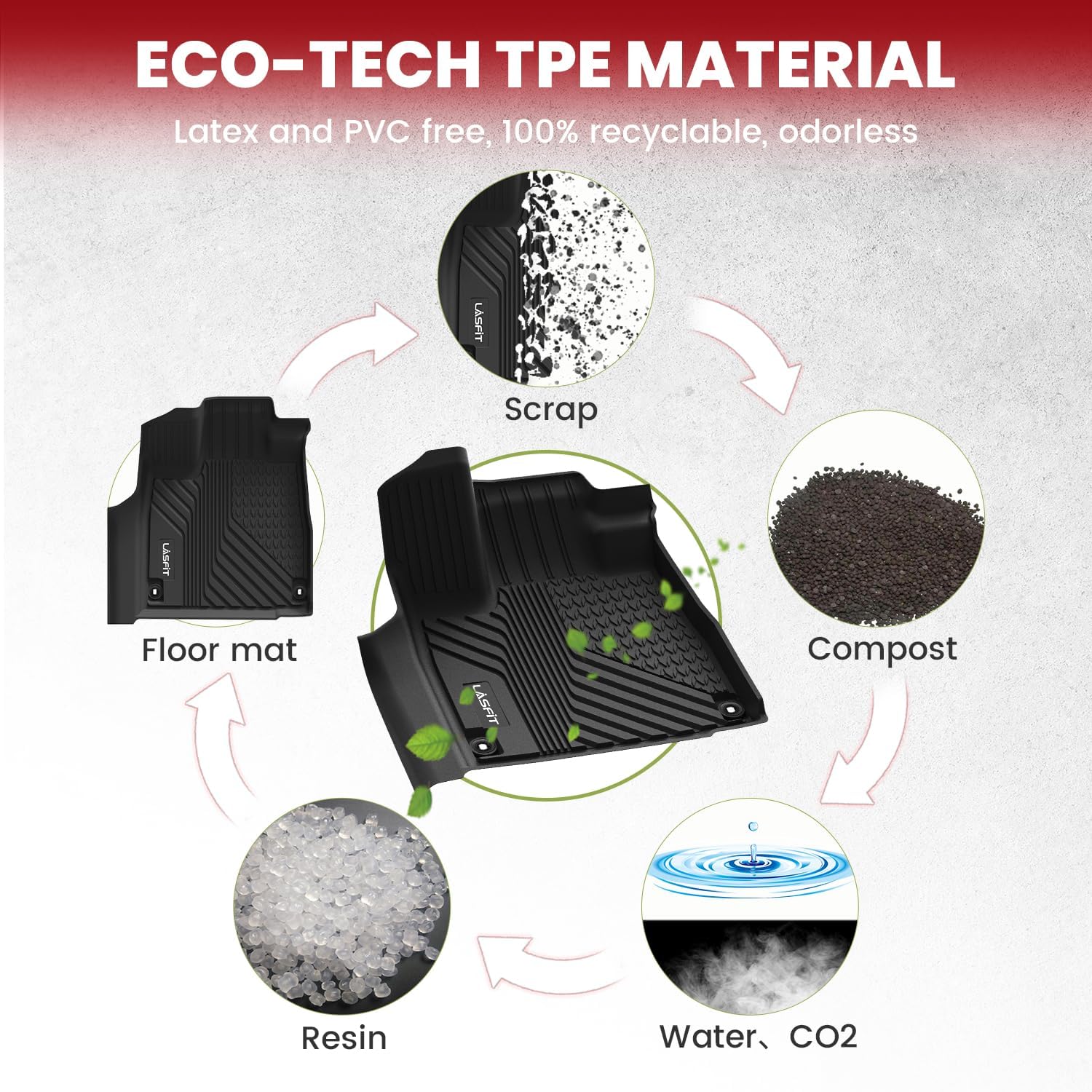 - ENVIRONMENT FRIENDLY- The All Weather Mdx floor mats & trunk mat & backrest mat use elastic TPE (Thermoplastic Elastomer), No foul odor is produced even at high temperatures. soft touch and exquisite finish. The Lasfit Mdx cargo mats are skid-proof and recyclable.