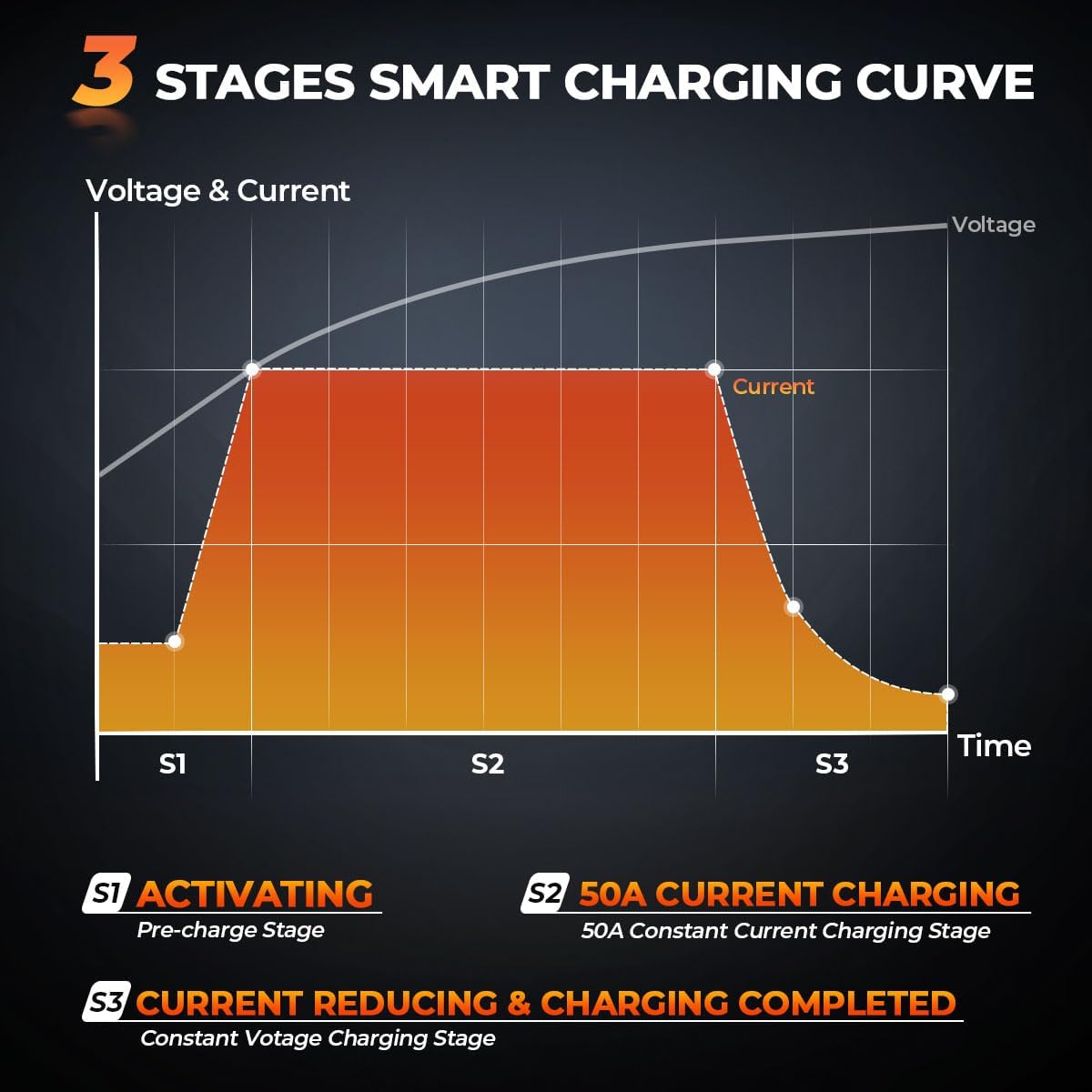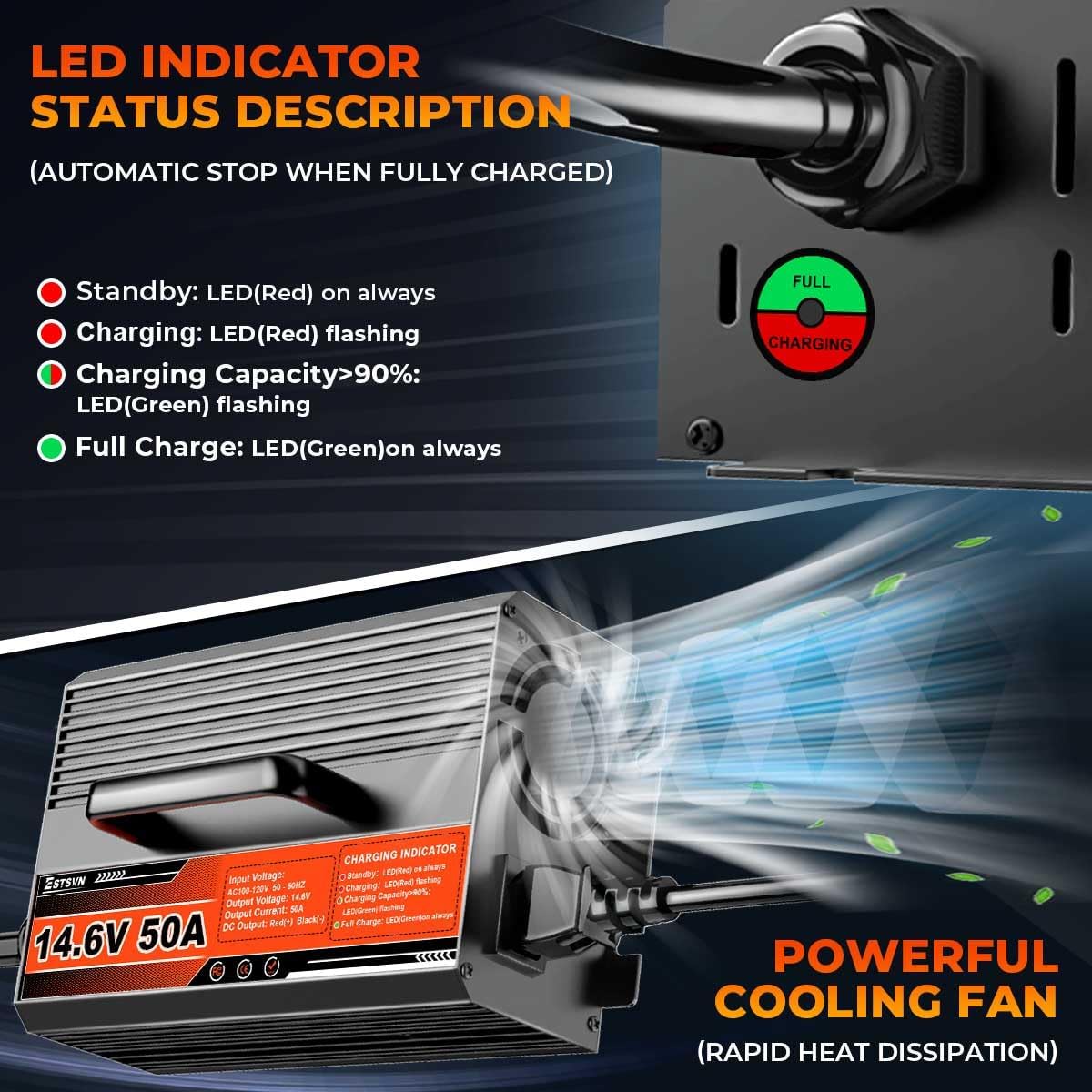 - đă50Amp 12V Fast Battery Chargeră: Our 12V (14.6V) 50A LiFePO4 lithium battery charger, charging voltage: 14.6V, charging current: 50A, input voltage: 100V-120V AC; 50Hz to 60Hz.Meanwhile, aluminum body and large cooling fan make the heat dissipation more efficient, reducing power waste and improving charging efficiency.And supporting a 0V charging function to reactivate the battery.