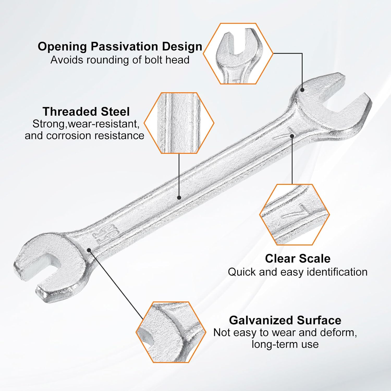 - Material - Our double open-end wrench is made of threaded steel with high hardness and excellent wear resistance. The surface galvanizing improves its wear resistance, keeps its surface smooth and reduces wear, is not easy to deform, and can be used for a long time.