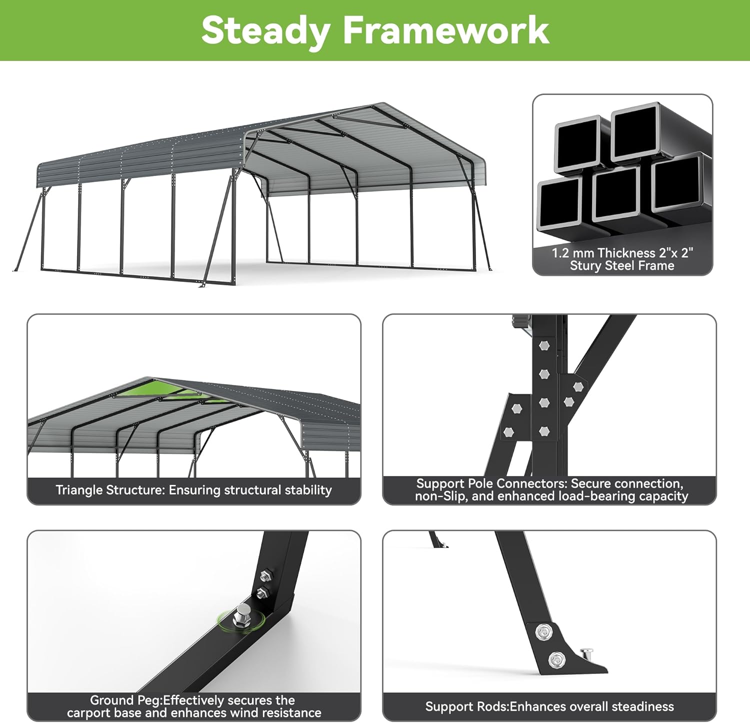 - Enhanced Stability: With 10 heavy-duty ground anchors and 4 reinforced support legs, the carport delivers exceptional steadiness, capable of resisting strong winds and substantial snow loads with ease