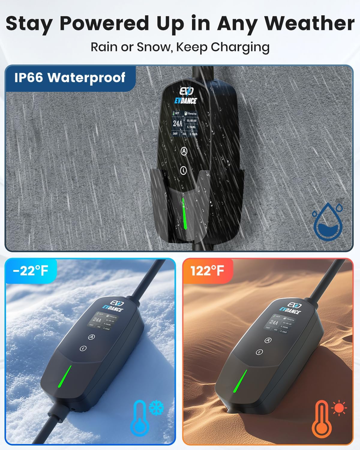 - Nonstop Safety & Weatherproof Charging with UltraGuard Charger: Equipped with 6-advanced safeguards — lightning deflection, leakage blocking, smart current/voltage control, thermal shutdown, and anti-overcharge tech — EVDANCE 24A LEVEL 2 mobile charger defends Tesla-Compatible EVs and household wiring 24/7. Built tough with IP66-certified casing (operates in -22°F to 122°F), this Tesla-equipped home charger LEVEL 2 handles rain showers and dust storms for daily use, but do NOT operate during hurricanes, thunderstorms, or flooding — unplug immediately and store indoors. Note: Always cover connector head with included cap when stored; Plug-socket remains non-waterproof.