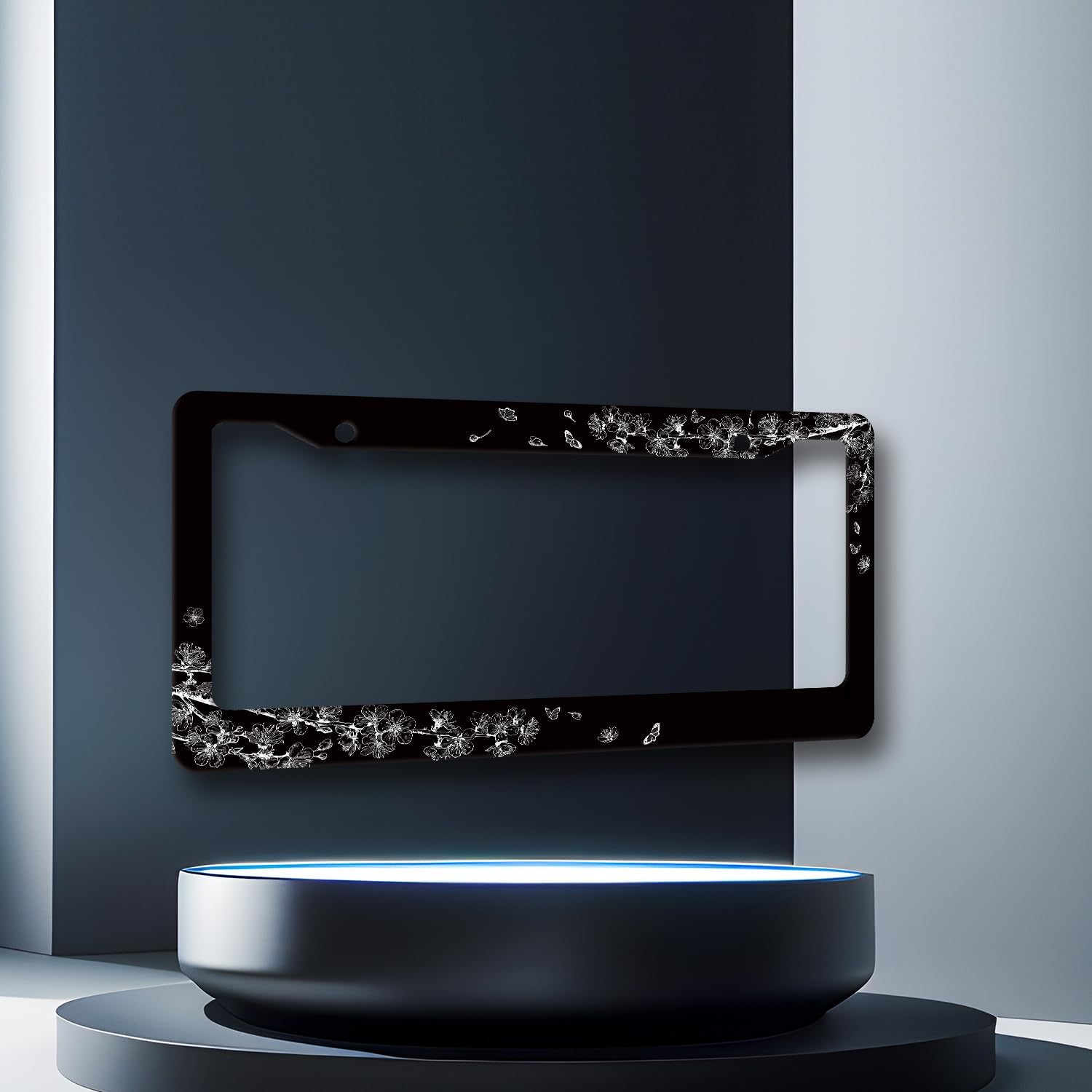 Black White Cherry Blossom License Plate Frame Butterfly Flower License Plate Holder Stainless Steel Car Accessories Decoration 6.3"X12.3" with 2 Holes Screws