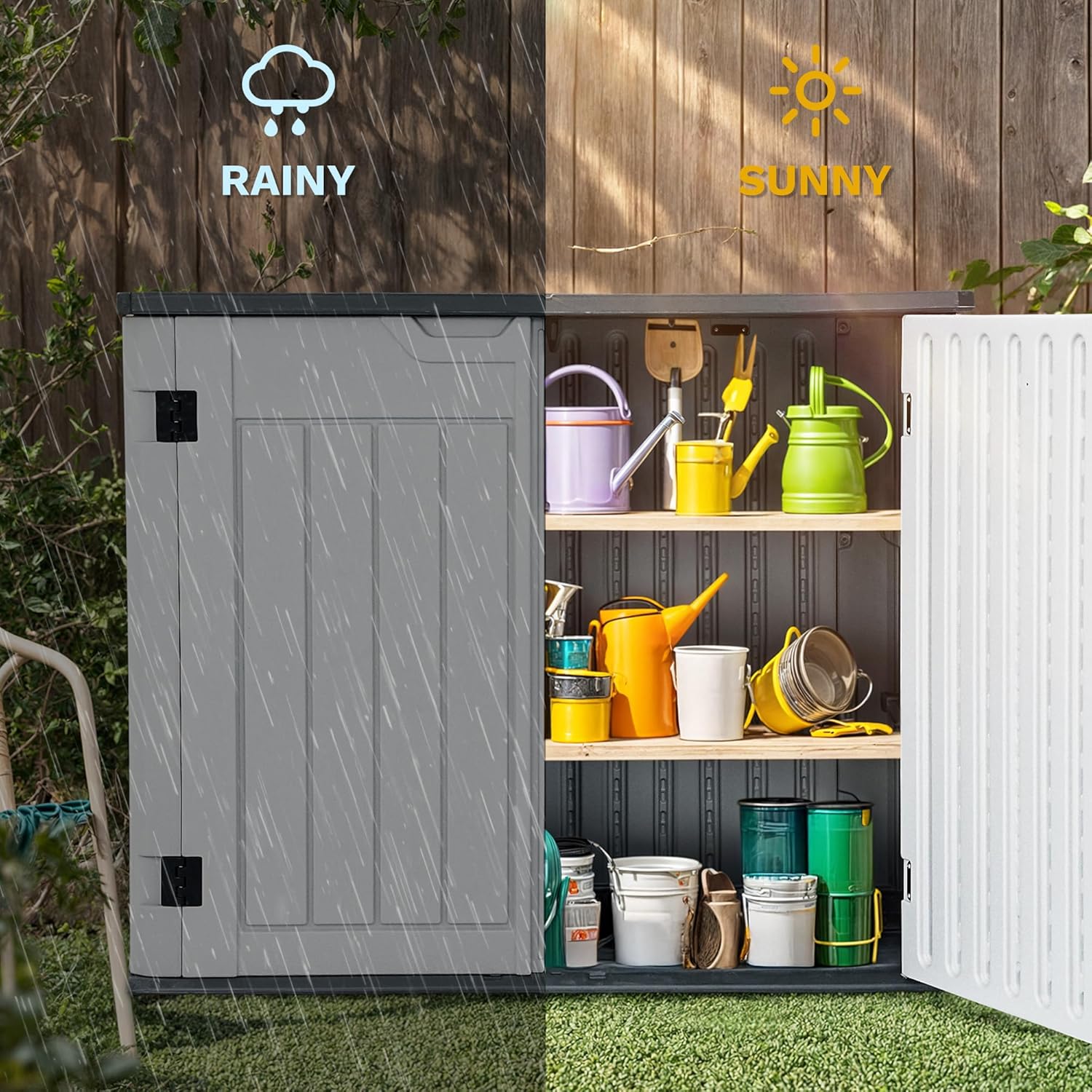 - Weatherproof Durability: Crafted from weatherproof resin, this garden storage unit ensures UV protection, year-round functionality, effortless upkeep, and a lasting wooden aesthetic; The novel lid effectively repels water, maintaining the allure of the wooden texture