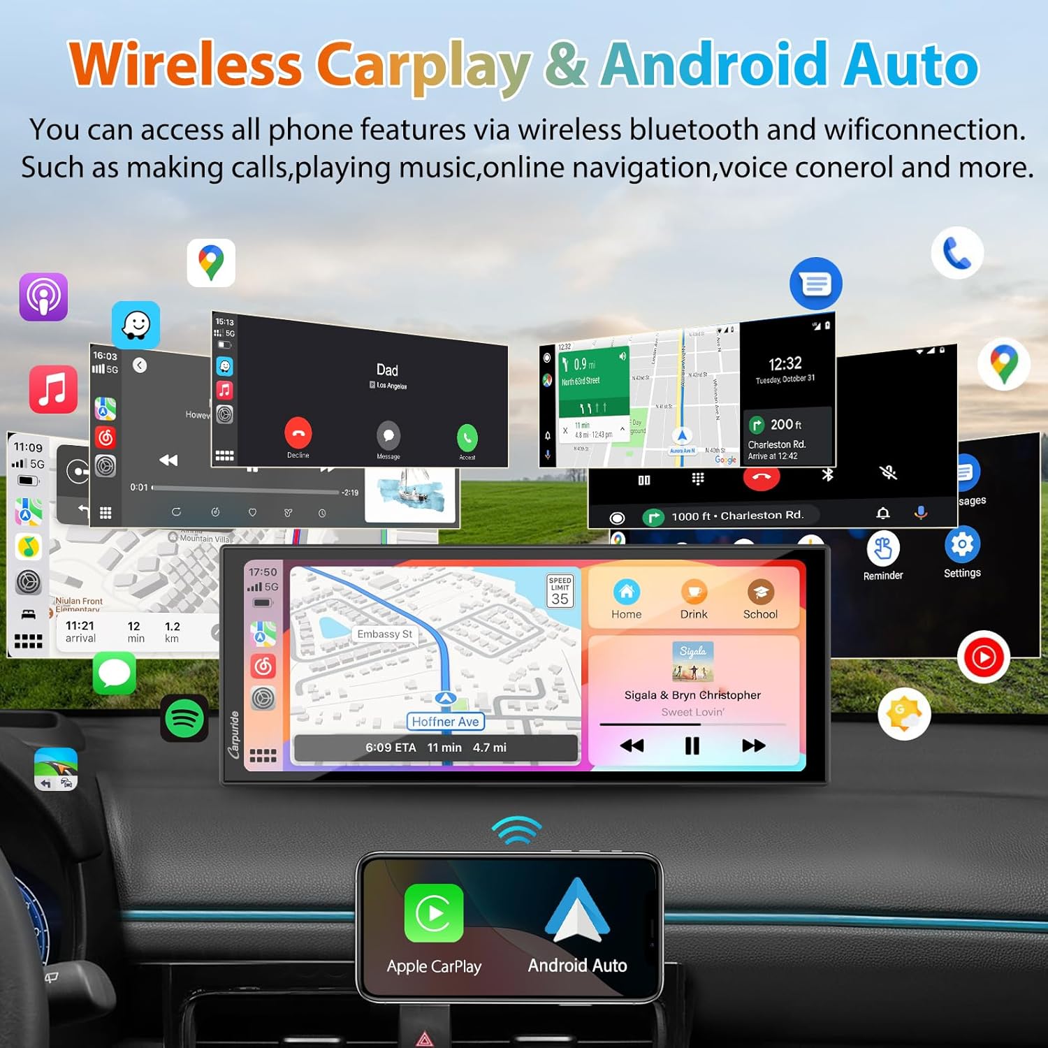 - ăSeamless Integration with Smartphone(IOS/Android)ă CARPURIDE 11.26" portable car stereo compatible with Carplay & Android Auto. After link wirelessly, puting all your phoneâs best features in a clean, safe, and easy-to-use hd touchscreen, wirelessly handle gps navigation, messaging, phone calls, bluetooth music, Siri. Compatible with IOS 6 and above, Android 11 and above.