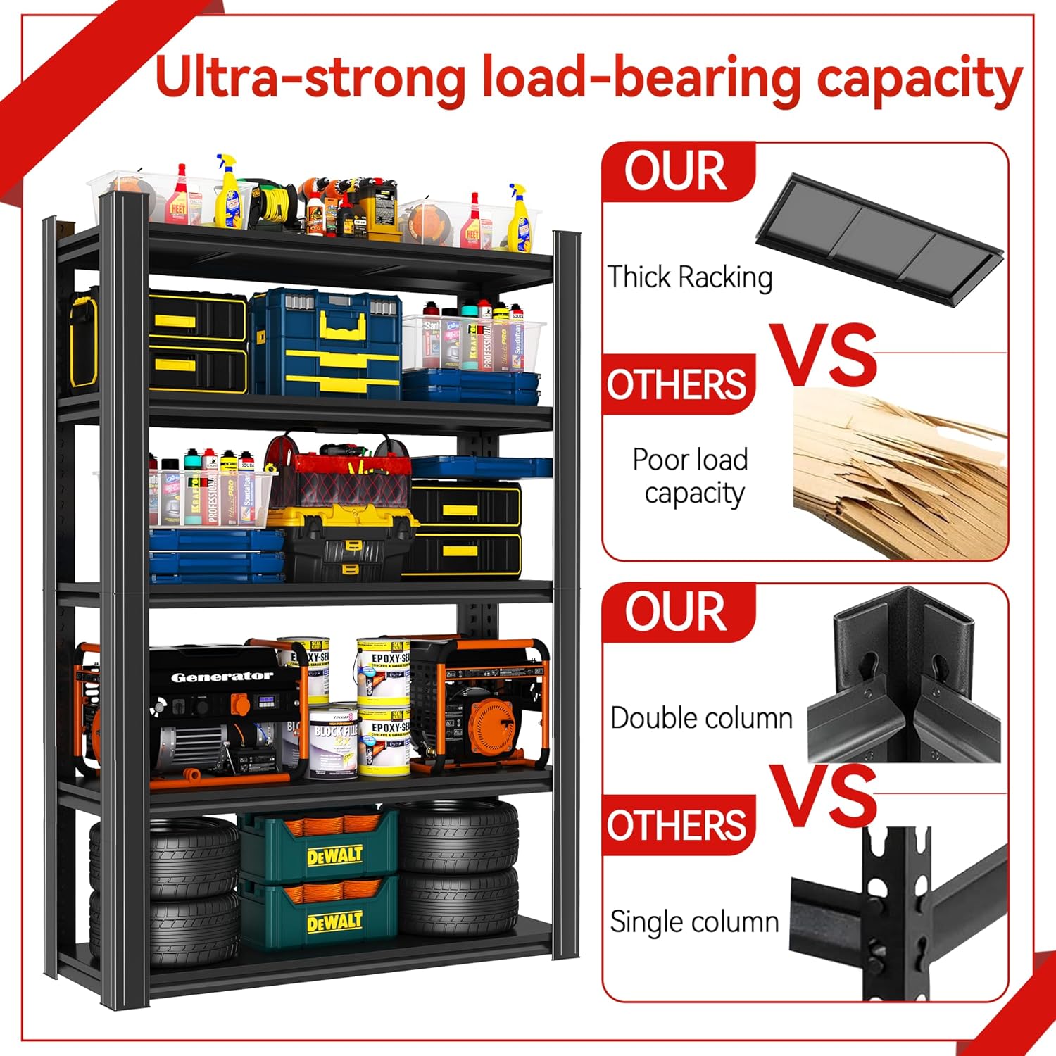 - ă Upgraded Dual-Layer Columns for Enhanced Stabilityă Unlike standard shelves on the market that use single-layer columns, our product features upgraded dual-layer columns that significantly boost stability and load-bearing capacity. The reinforced structure helps distribute the weight evenly, reducing the risk of warping or sagging over time. This ensures the shelf remains stable even under heavier loads. In comparison, shelves with single-layer columns can wobble or bend when storing heavier items, making them less reliable for larger, bulkier tools or materials