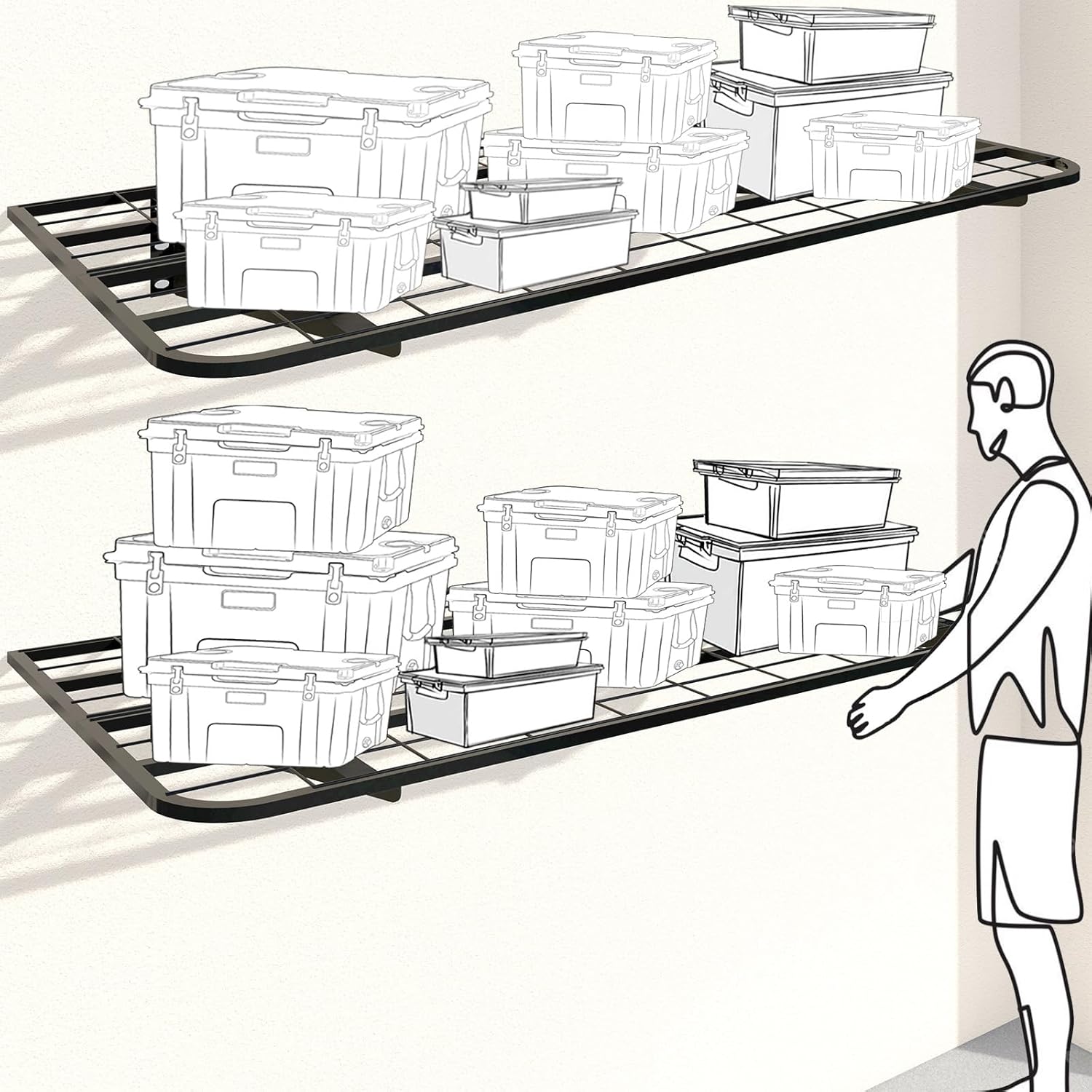 - 【Garage Shelving】: Includes a 2-pack of wall mounted garage shelves, each measuring 24 x 48'IN, perfect for holding storage bins, boxes, sporting goods, tools, and more. say goodbye to cluttered garage space storage.