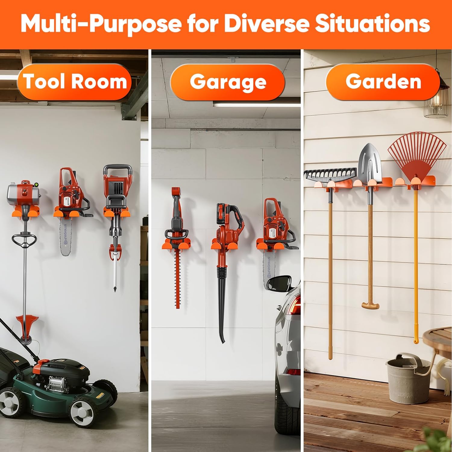 - Save Space: The weed eater holder wall mount provides efficient storage, keeping your tools tidy and organized. It frees up additional space, preventing your work area from becoming cluttered. This stand is suitable for various locations, including garages, gardens, terraces, basements, warehouses, farms, yards, workshops, workspaces, backyards, sheds, cars, and storage rooms.