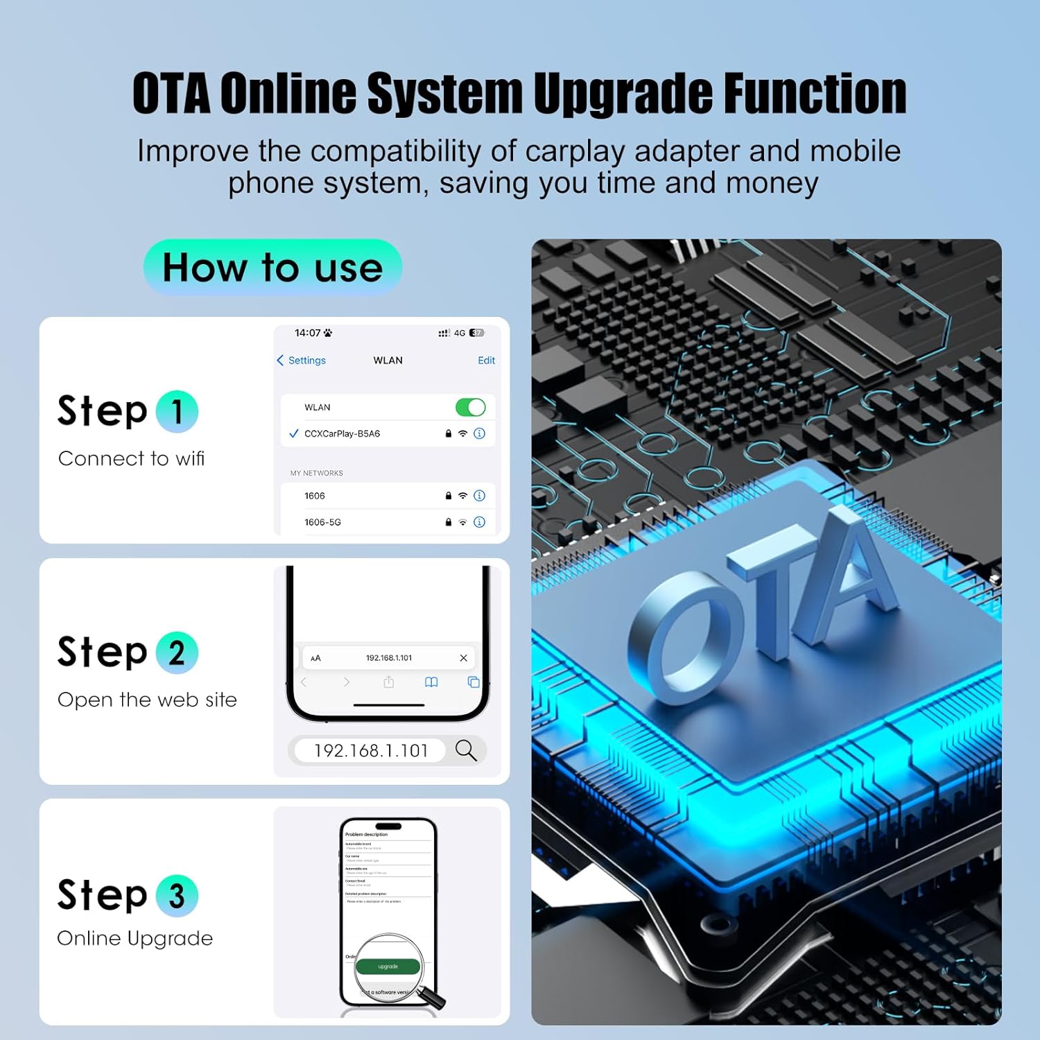 - ăMultiple Control ItemsăThe apple car play wireless adapter retains the four original controls of the car voice assistant, steering wheel, touch screen, and central control button, making your operation safer and more convenient during driving. Also,the wireless carplay adapter supports OTA upgrades to improve the compatibility of the IOS system and wireless carplay, and can be quickly upgraded separately without additional costs