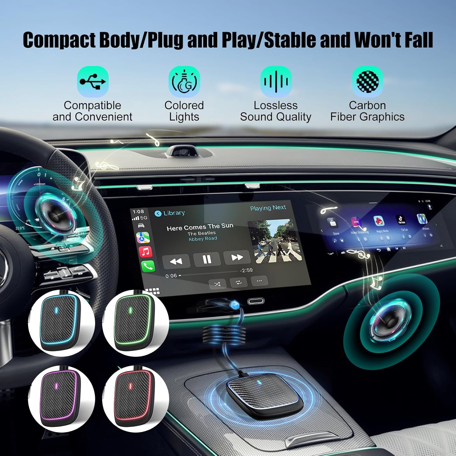- ăCompact Stylish DesignăThe mini wireless carplay adapter does not take up space and easy to setup. Wireless design allows you to say goodbye to the messy wired countertops. The car play wireless adapter equipped with coloured lights design to add richer visual effects to the car.Also this wireless carplay adapter for iphone uses carbon fiber graphics are stronger and lighter, making the wireless carplay adapter appearance looks more sporty