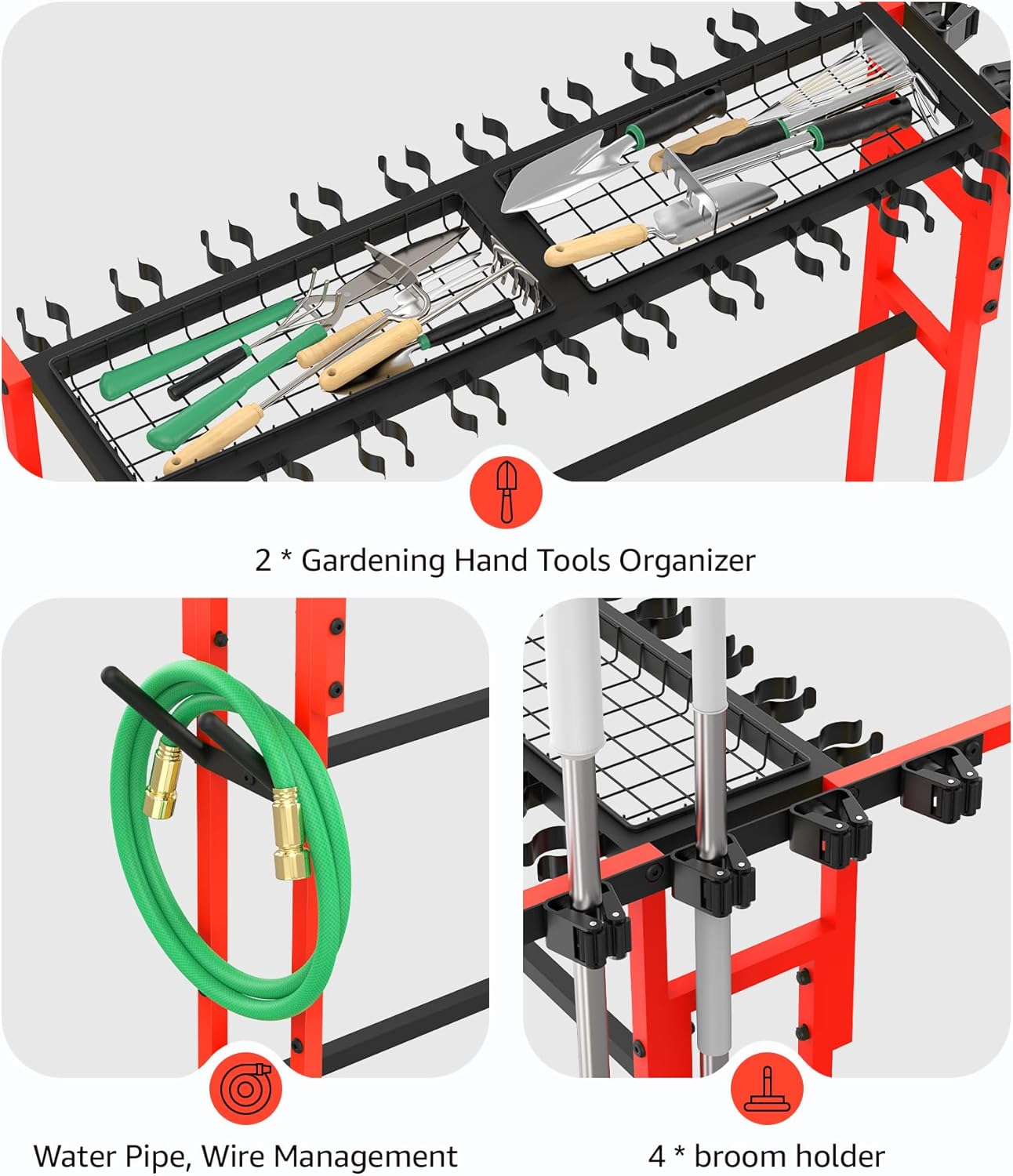 - Multi-functional floor stand tools organizer can stores 4 brooms and 20+ yard, farm, lawn tools with 2 of baskets for smaller accessories, with plumbing, wire storage. And the bottom shelf can store boxes, buckets, showerheads and other tools.