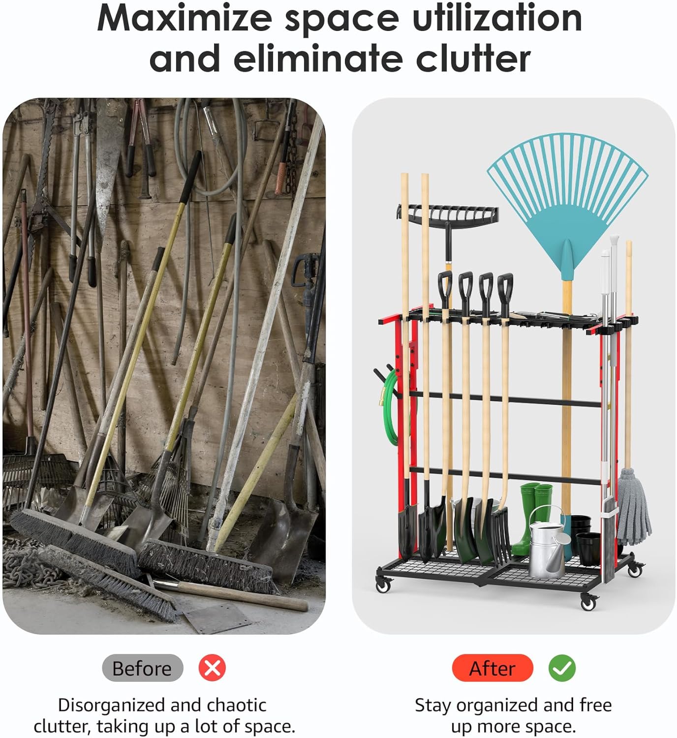 CCCEI Garage Organization with Wheels, Outdoor Gargen Yard Shed Tools Organizer Cart, Home Storage for Cleaning Supplies, Broom Holder, for Shovel and Rake, Long Farming and Farming Tools, Red.