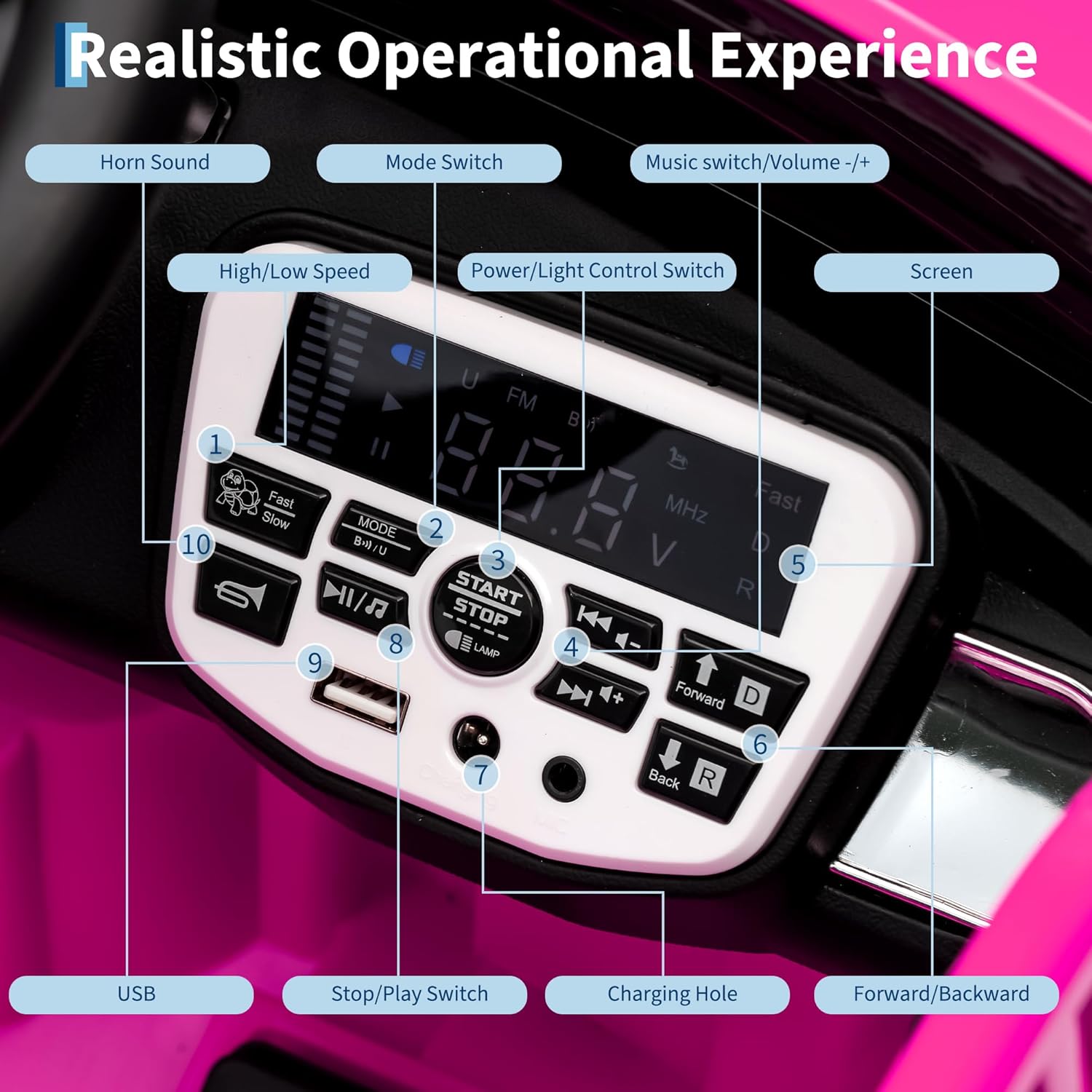 - Interactive Entertainment Features. This exciting ride-on car keeps kids engaged with built-in music, realistic horn sounds, and speed variations - plus a USB port to play their favorite songs. The convenient battery meter helps parents monitor power levels for uninterrupted fun
