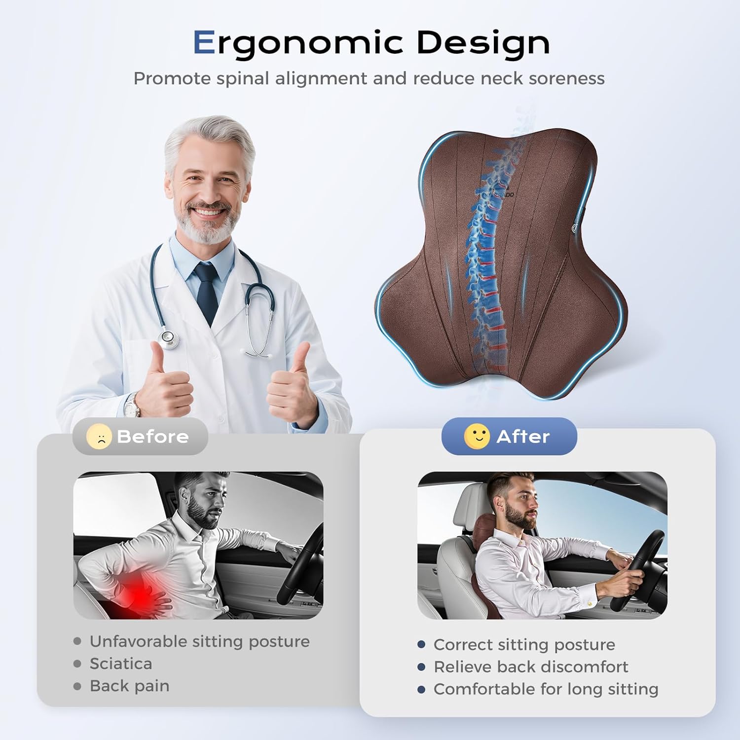 Coverado Car Lumbar Support Pillow and Car Neck Pillow Kit, Ergonomic Design Car Headrest Pillow for Driving, Relax Back Head Muscles Relieve Driving Fatigue, Breathable & Removable Cover, Coffee