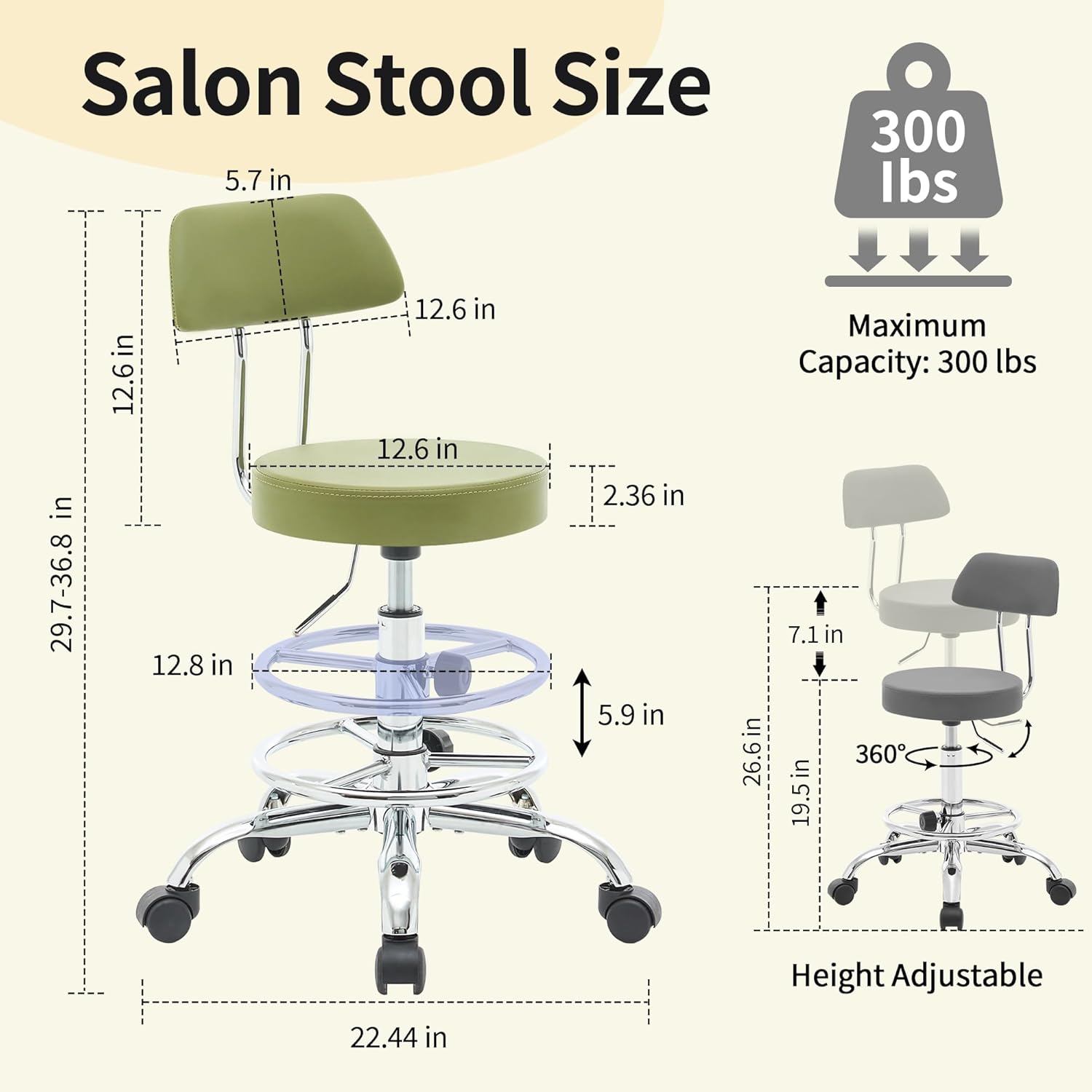 Height Adjustable Stool 19.5’’-26.6’’, Rolling Chair with Back and Footrest, Green Esthetician Stool Ergonomic (Green)
