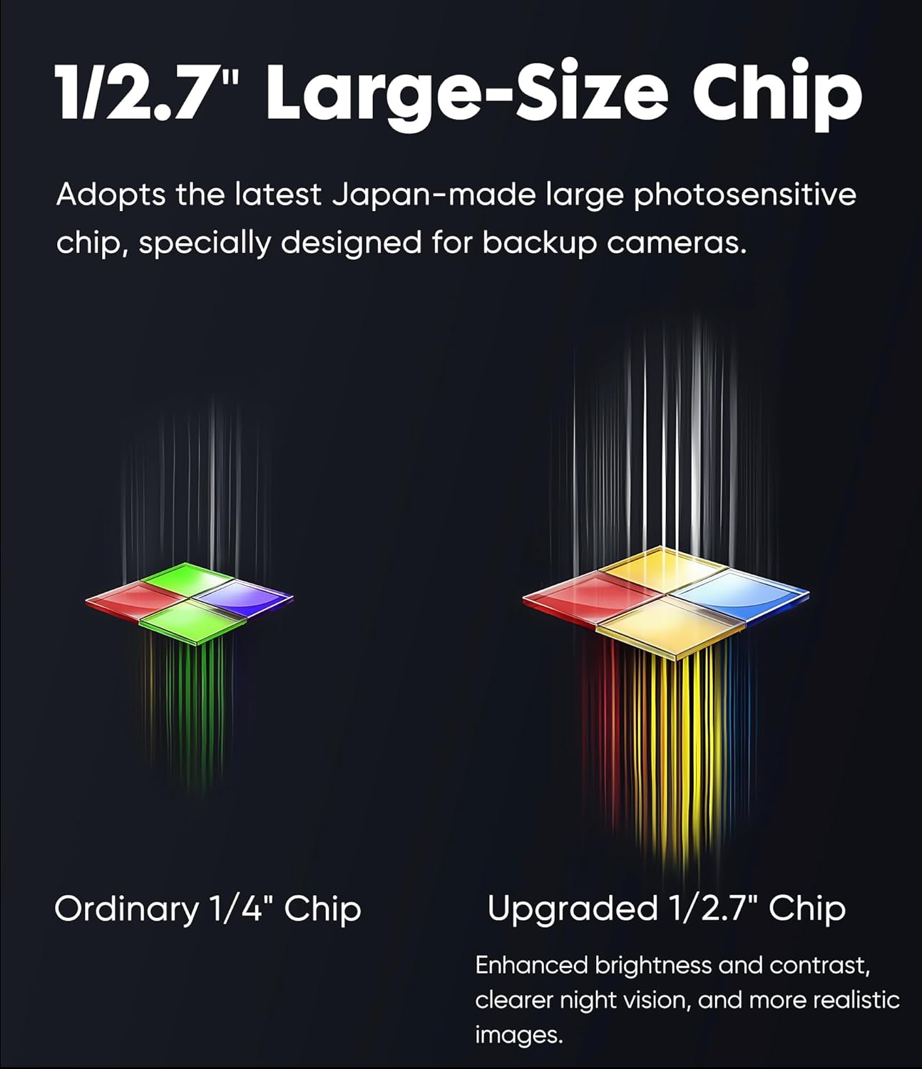 - 【Made-in-Japan Chip, Ultra HD Night Vision Wide Angle】 XS-2 reverse camera for car equipped with Japan-made high-definition AHD image chip, combined with 1/2.7-inch high sensitivity image sensor and 170° high transmission wide-angle lens, not only greatly improve the brightness and color realism during the daytime, but also present a clear and sharp picture at night or in low-light environment. It effectively eliminates blind spots and low obstacles, and improves the safety of reversing.