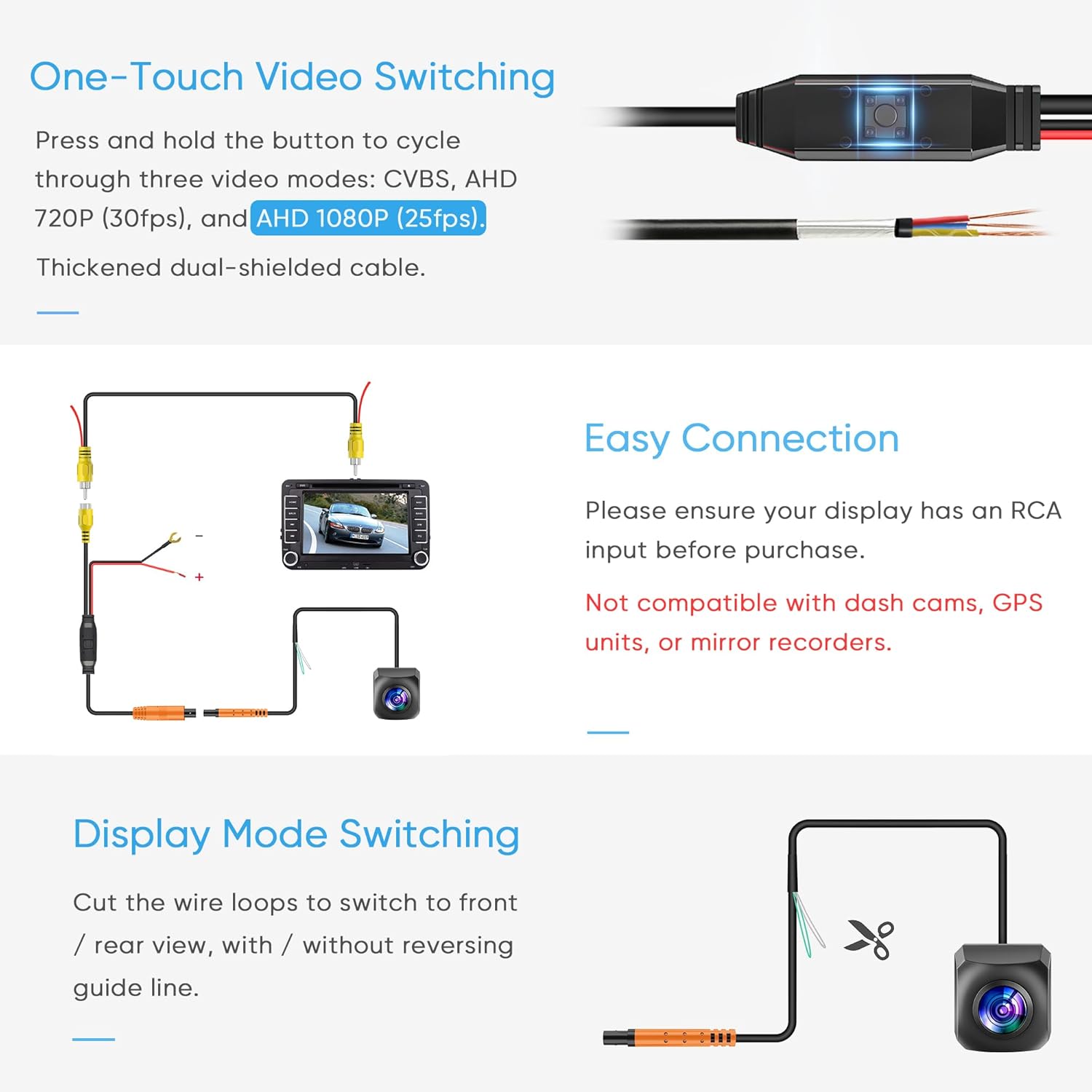 - 【Multi-mode Signal Free Switching】Equipped with a built-in switch button, XS-2 backup camera for car SUV supports CVBS, AHD 720P (30fps), and AHD 1080P (25fps) video output formats. Which can be flexibly switched according to the screen format to easily match the mainstream in-car displays on the market. Without upgrading the head unit, enjoy crisp, smooth, and stable images with this reverse camera.
