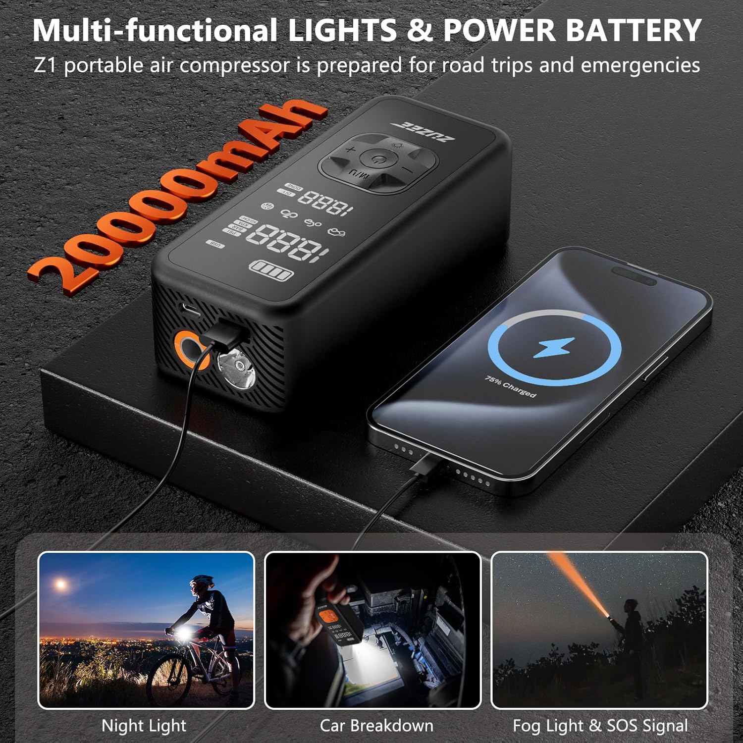 - [Thoughtful emergency tool] - This cordless tire inflator can be an emergency tool. In the dark, the multi-function LED light can help you solve vehicle failures, alert pedestrians or send distress signals. It is also an emergency power source for electronic devices. ZUZEE is ready for your road trips and emergencies anytime, anywhere.