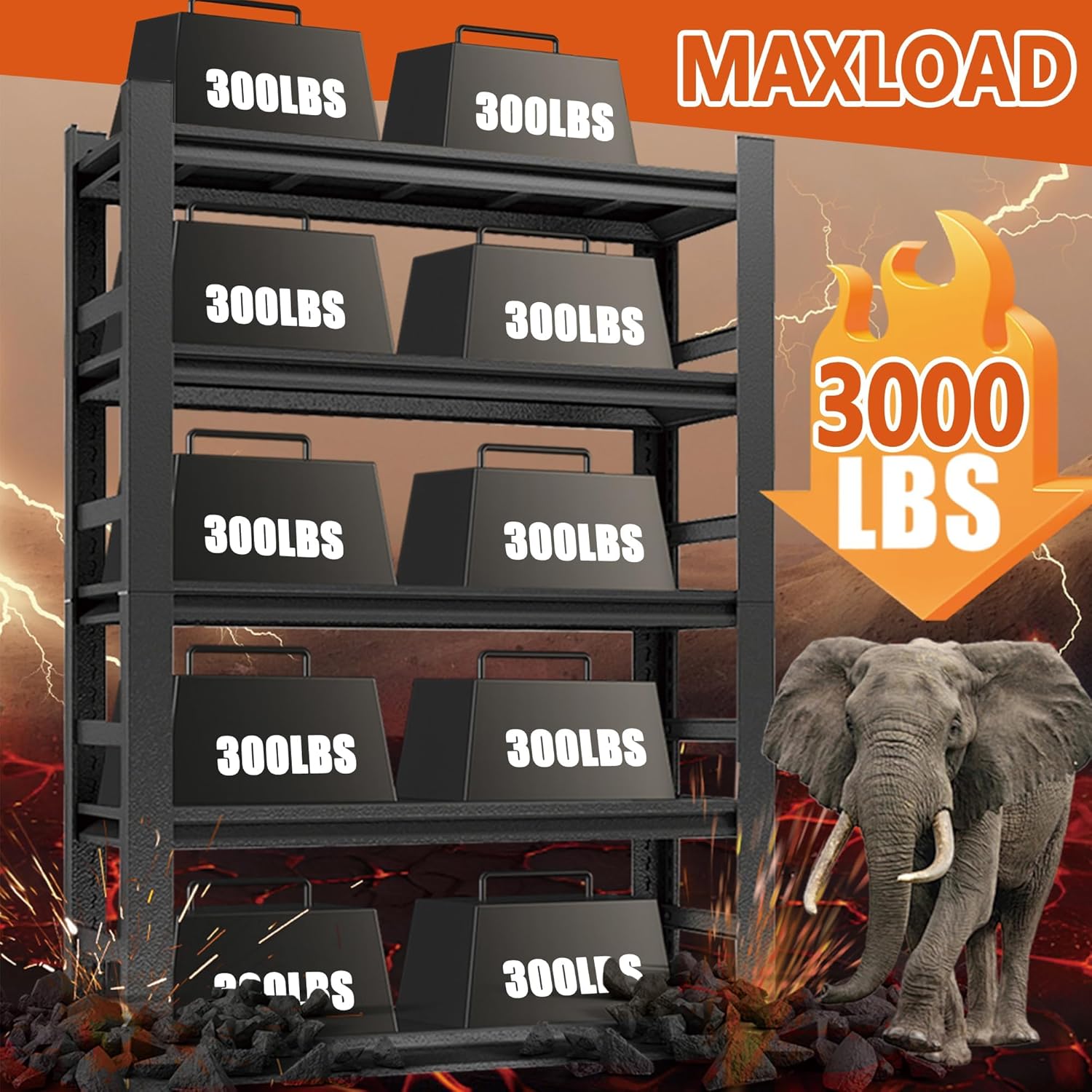 - ăHeavy-Duty 3000lb Garage Shelvingă Our heavy duty garage shelving boasts a 3000lb capacity, reinforced by double-thick steel columns. These industrial shelves provide ultimate durability for garage storage shelves, basement storage shelves, and workshops.