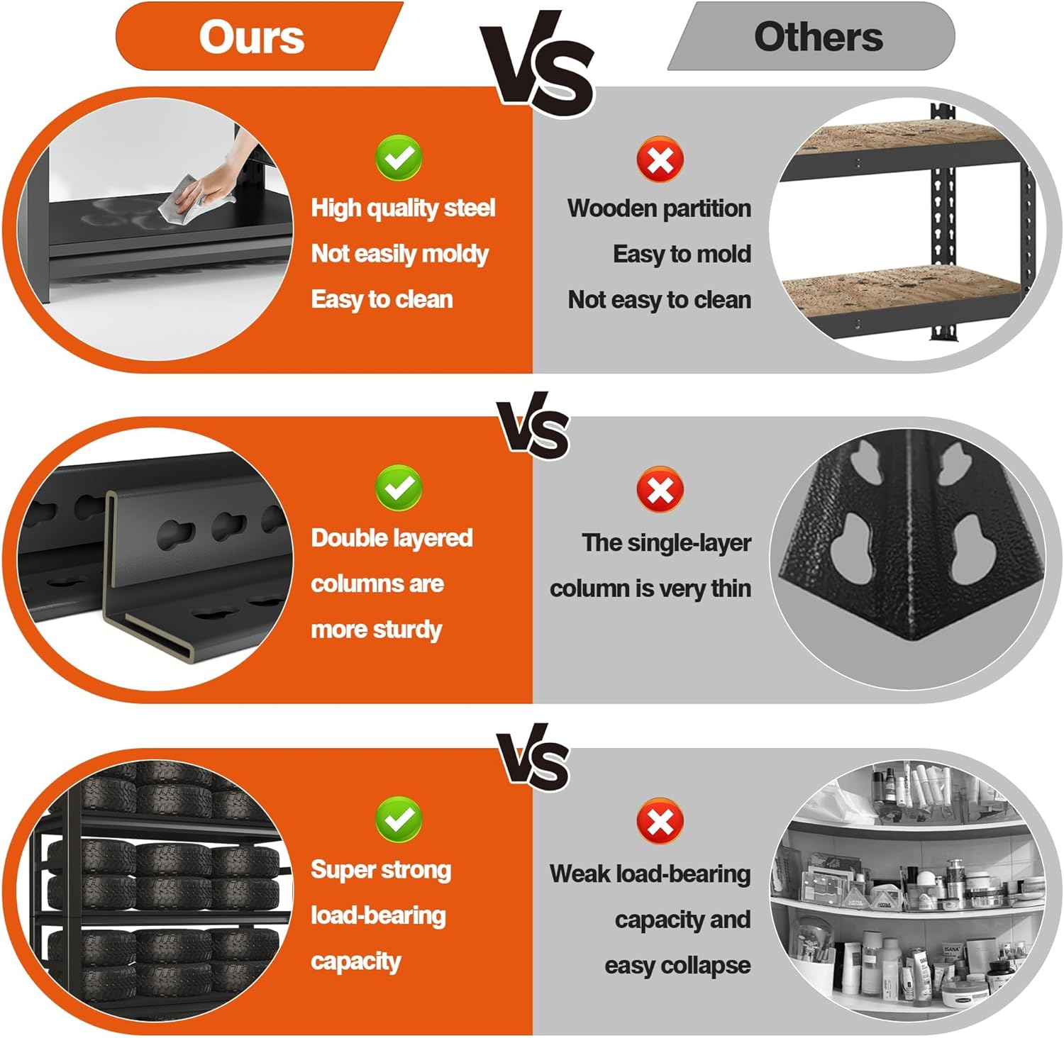 - ăAll-Steel Shelves for Maximum Stabilityă Constructed entirely with high-quality steel shelving, these metal shelves resist bending/warping. The robust garage shelf rack design secures heavy tools and equipment with unwavering stability.