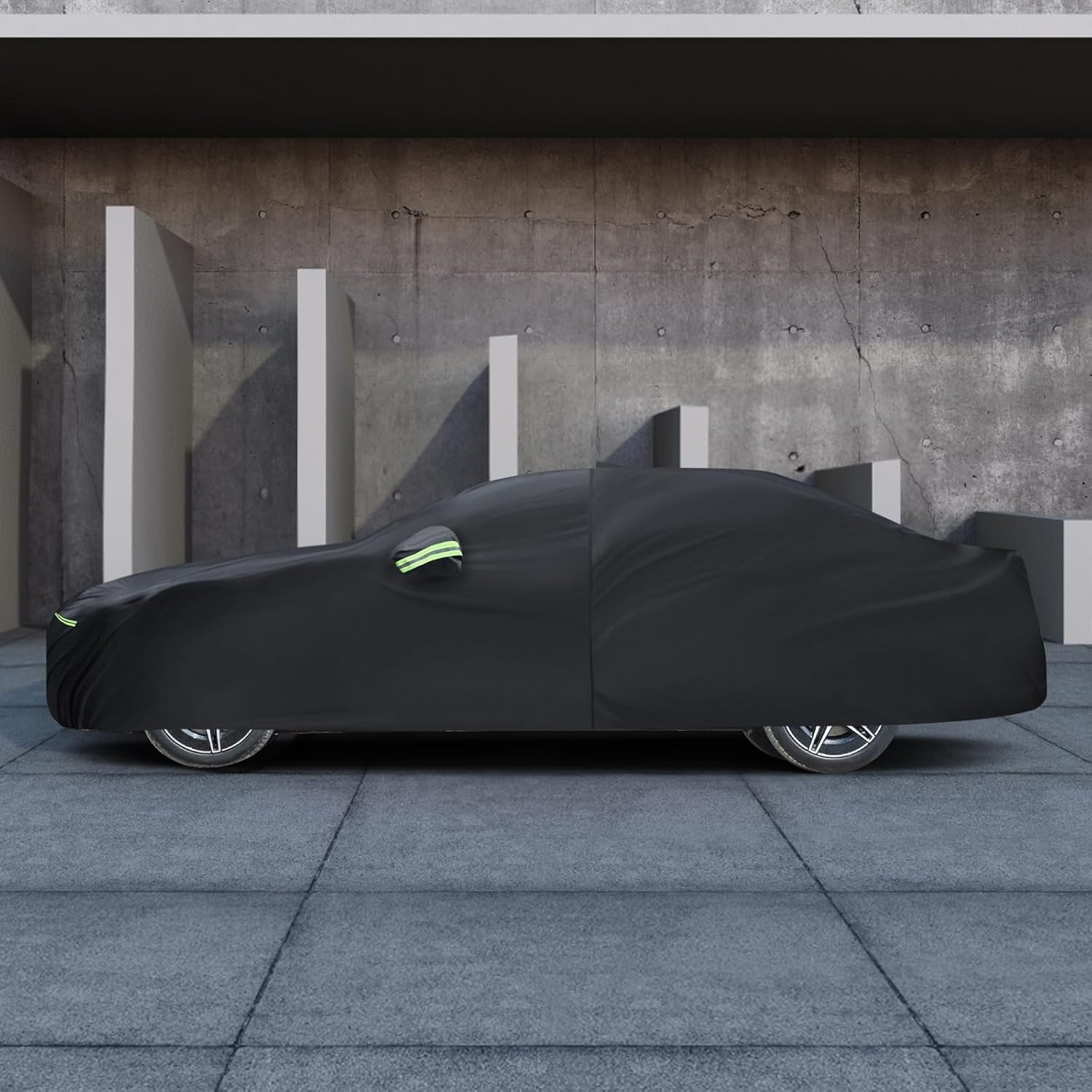 - Windproof design: All-weather waterproof car covers are specially designed to withstand strong winds. 1) Equipped with two bungee cords, it only takes a few seconds to attach to the tires on both sides, firmly covering the front and rear of the car. 2) There is a specially designed windproof belt at the bottom that runs through the middle of the car to ensure that the cover is not blown away. 3) Adjustable elasticated hem for easy sizing and securing the cover to the body.