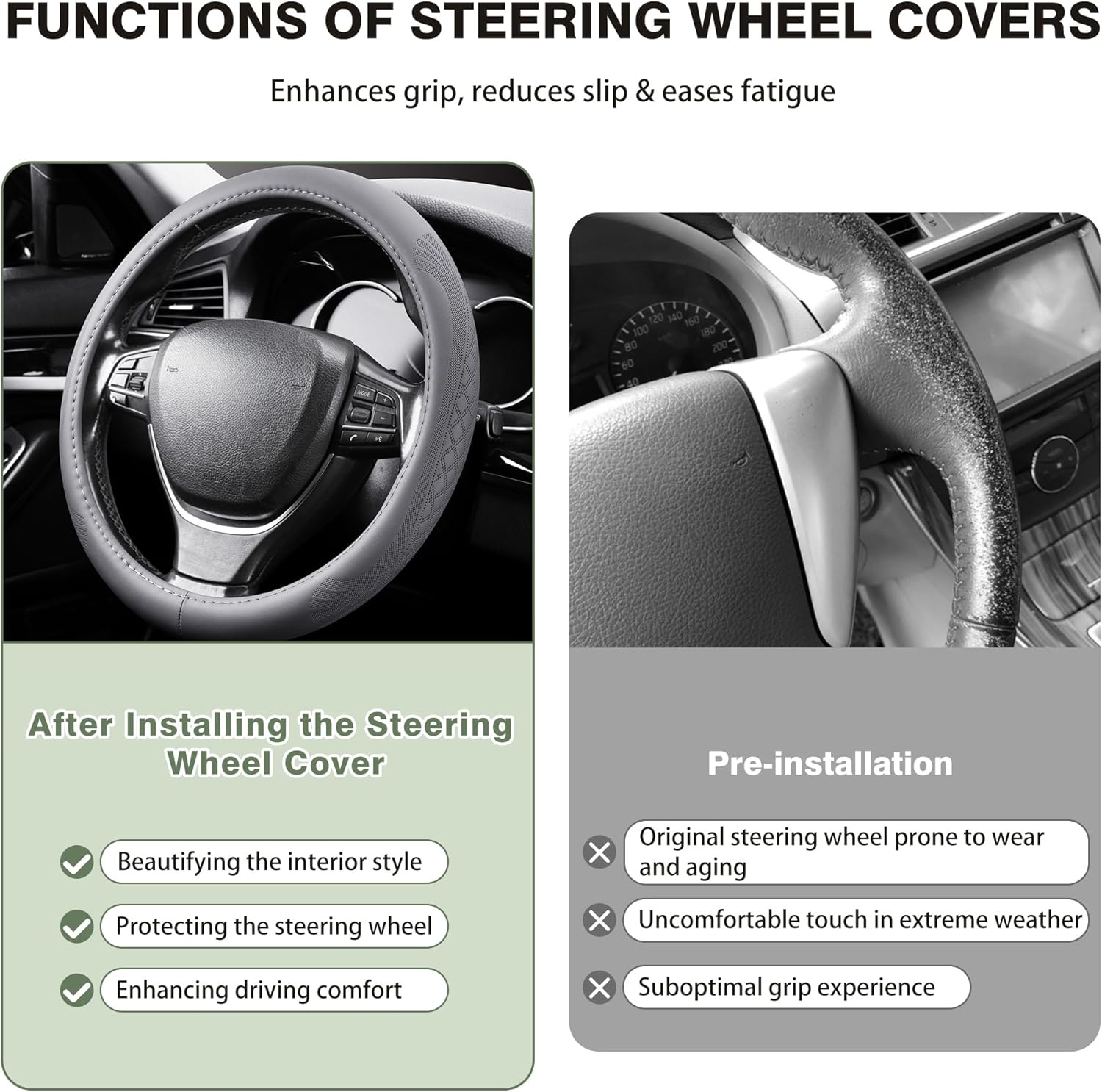 - 【Simple Installation】:It is easy to install. Due to the ductility of the material, any adult can easily install this steering wheel cover without tools.The creases will disappear completely after being fitted on the steering wheel for 1-2 days.