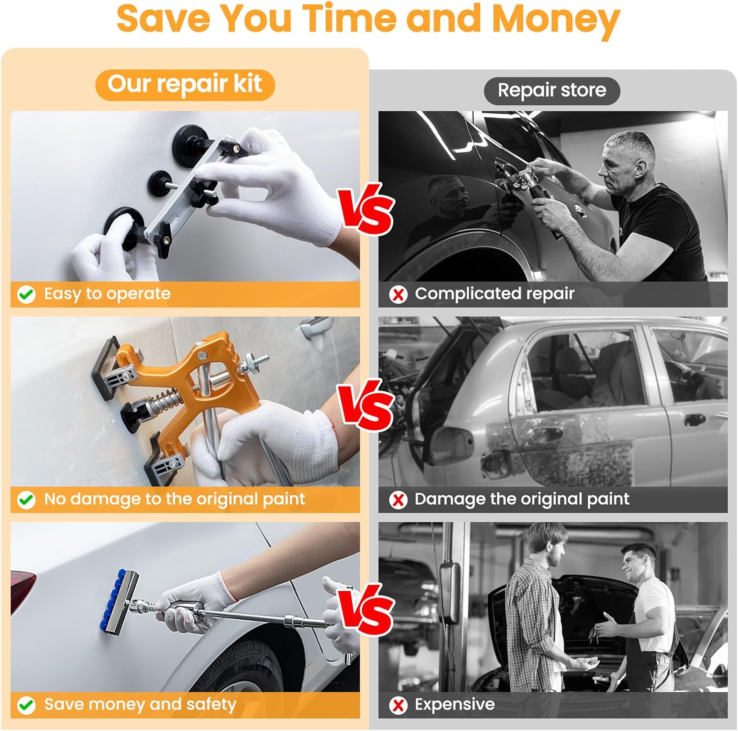 - Save Time & Money on Repairs: Avoid costly trips to auto body shops! This 134PCS dent puller kit lets you remove dents at home in minutes—no paint damage, no professional skills required. It's the perfect solution for dings, hail damage, and minor dents —saving you both time and money.