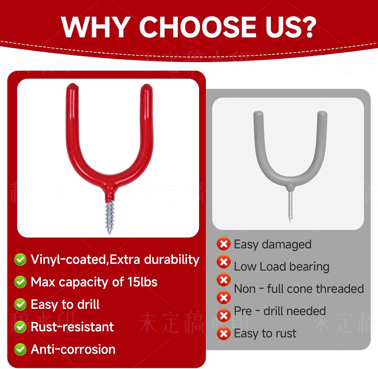 - **Two Mounting Options for Flexibility** *U-shaped hook* slot into pegboards, slat walls, or wire racks. *Screw-in hooks* allow direct wall or ceiling mounting for permanent storage