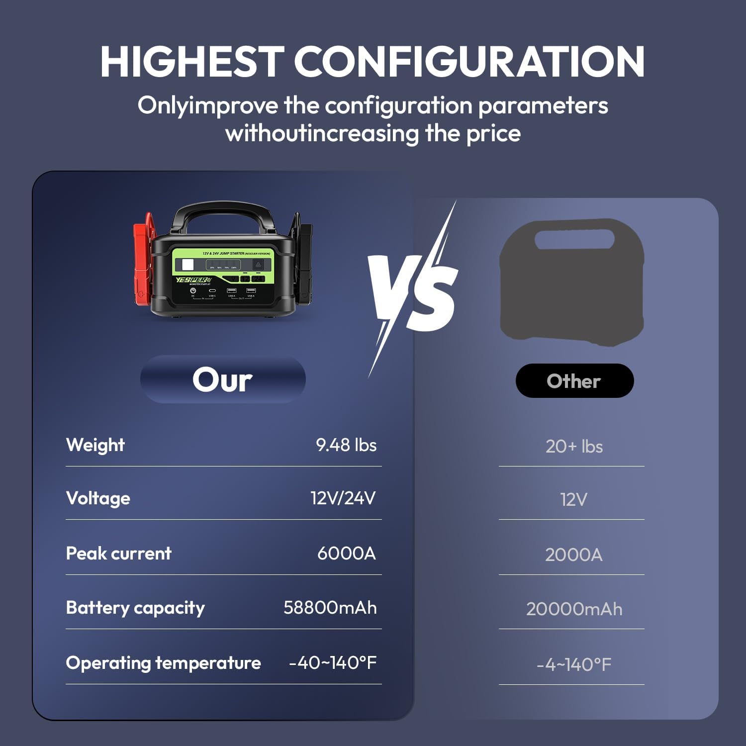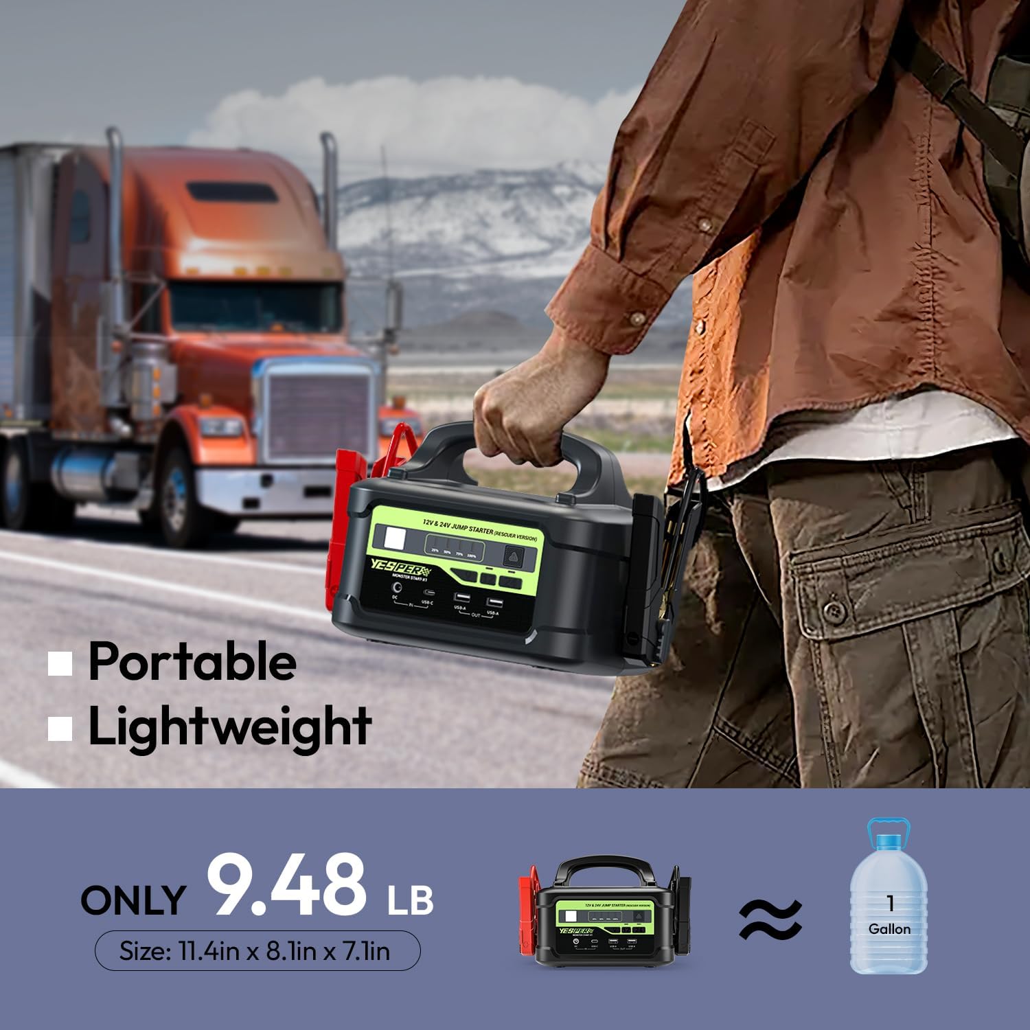 - ăPowerful Jump Starteră- YESPER MONSTER START-X1 is the latest upgraded heavy-duty 12V/24V car battery jump box for cars with 6000 amp peak starting current (suitable for all gasoline and diesel engines); it can automatically identify 12V and 24V cars and switch the starting voltage, suitable for all cars, trucks, motorcycles, boats, RVs, tractors, ATVs, UTVs, lawn mowers, snowmobiles, etc