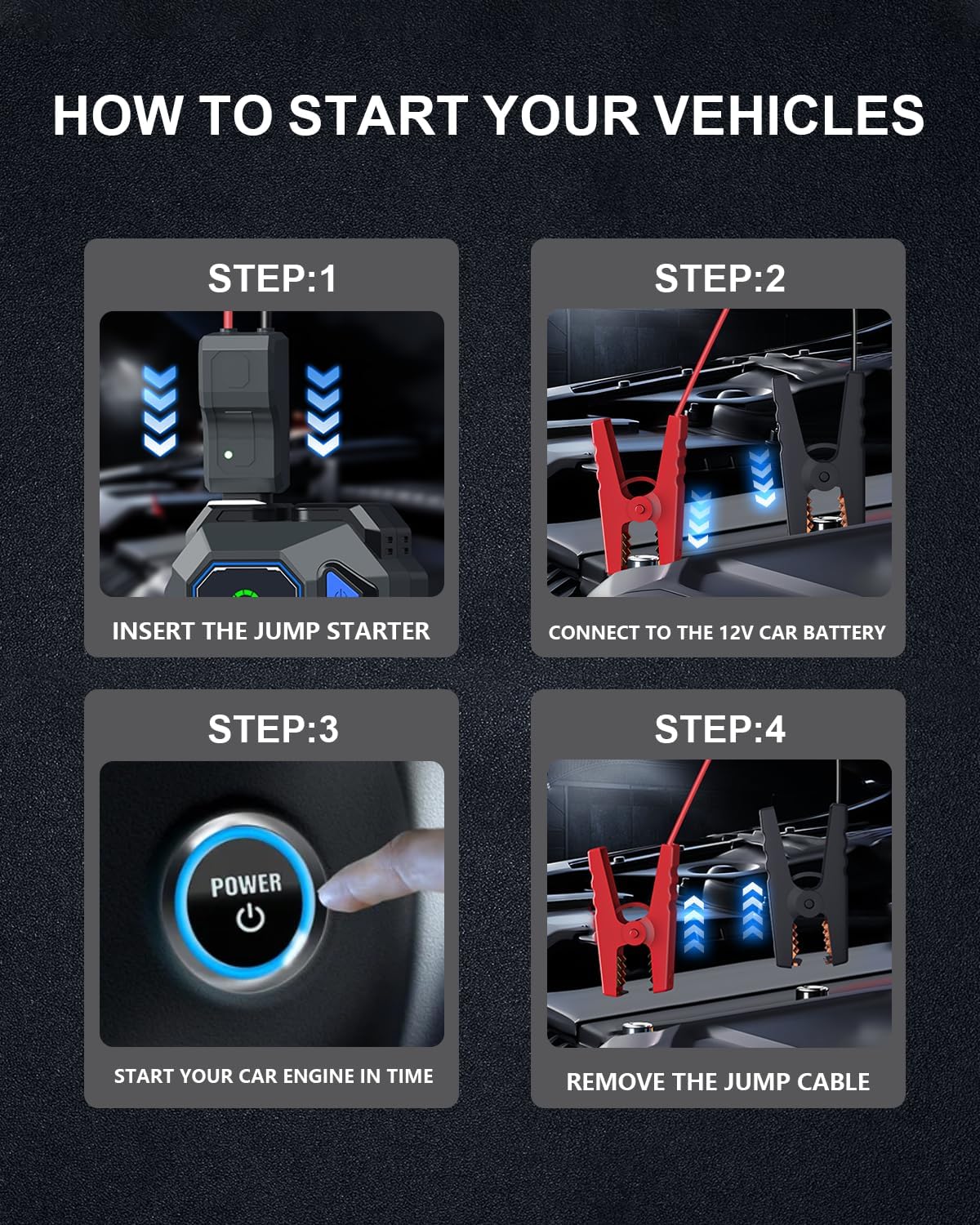 - 18W fast charging:2500A car jump starter battery pack doubles as a portable power bank. Dual USB-A ports (up to 18W) charge your multiple devices at the same time, such as cell phones, tablets, car air compressors and so on. USB-C 18W input port for faster self charging. Whether it's car emergency or daily charging, the car battery charger jump starter is ready to provide strong power anytime and anywhere, making it a perfect choice for travel or camping.