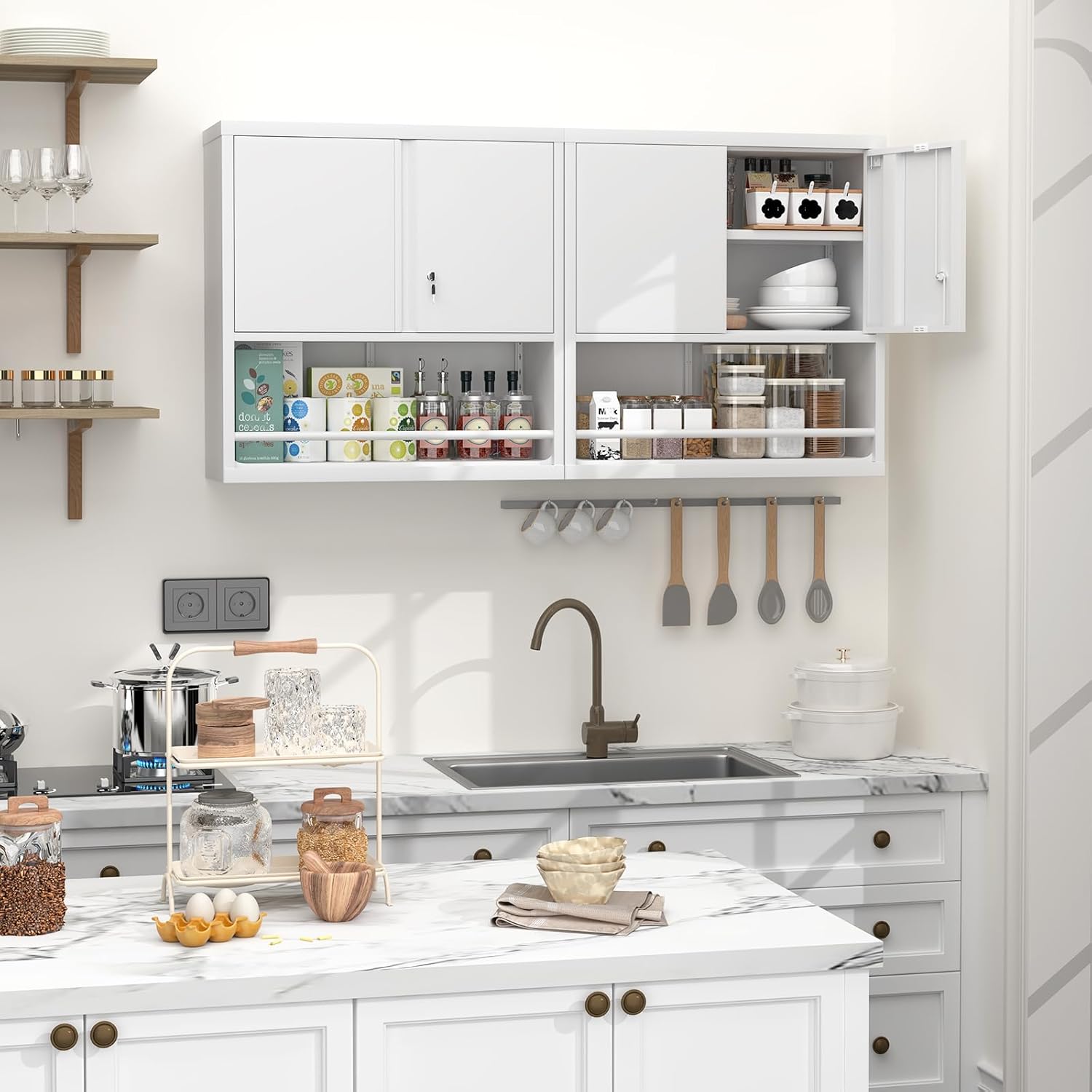 GREATMEET Locking Metal Garage Storage Cabinet with Doors and Shelves, 31" H Lockable Wall Cabinet Storage, White Steel Wall Mount Cabinet for Office